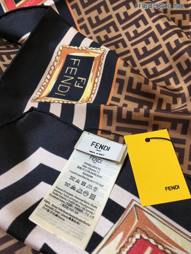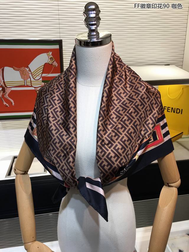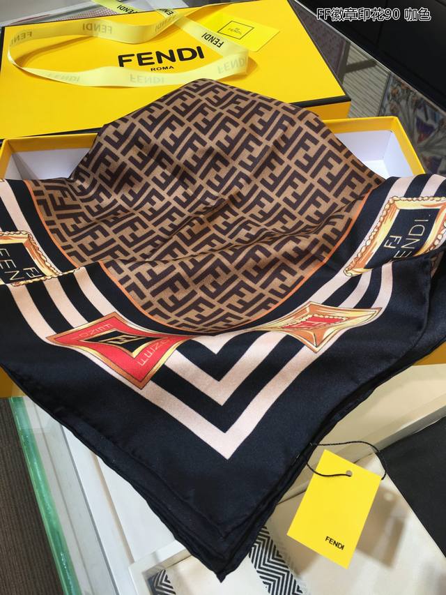 Fd's latest counter flagship Ff badge print 90 silk square scarf is very easy to match for vacation and daily wear. The private order flow makes you want to go on vacation as soon as you see it. It is also very easy to match with daily wear. The whole person will look energetic. Needless to say, the details and quality are clearly visible. It is definitely a high-specification quality that will be praised. 90*90Cm, 100% top-grade twill silk, hand-curled