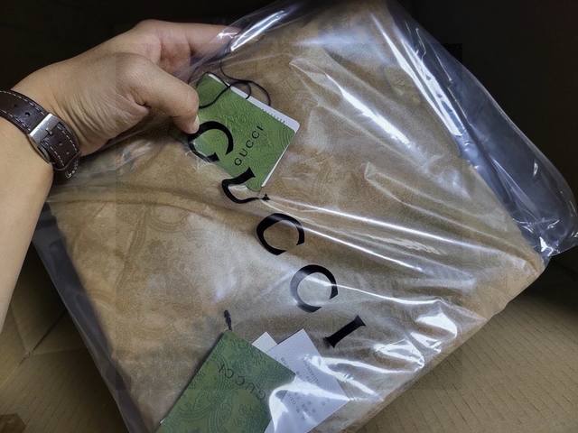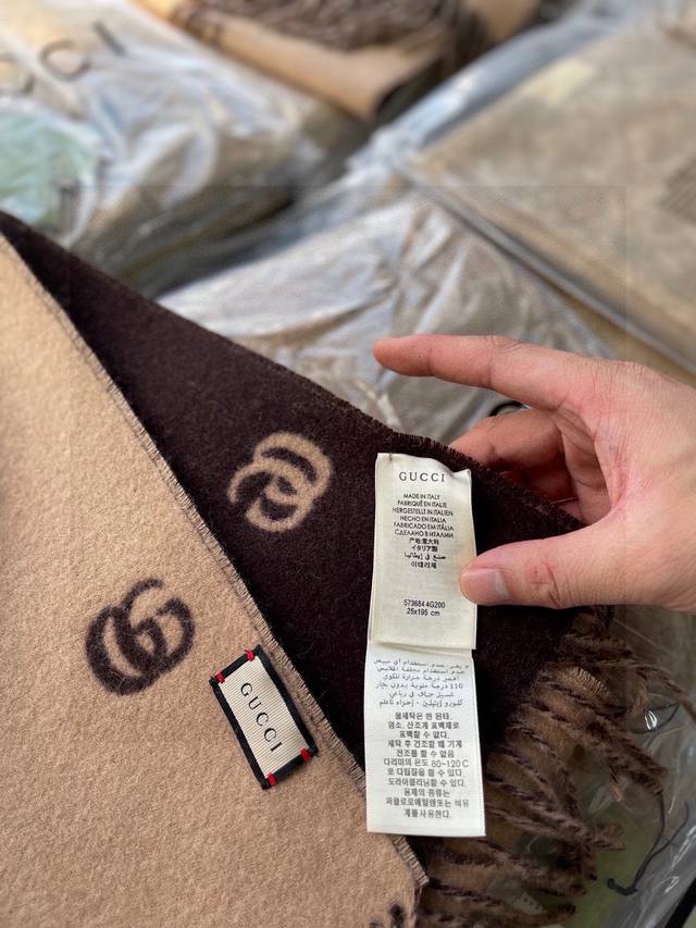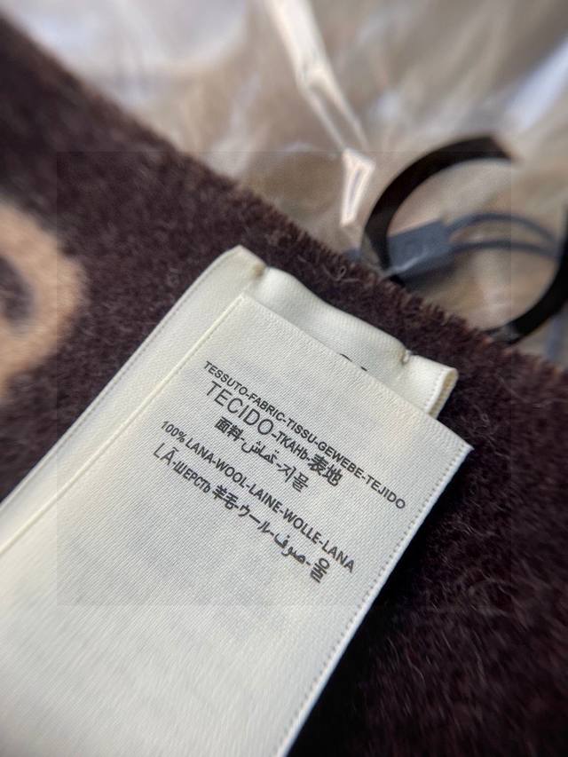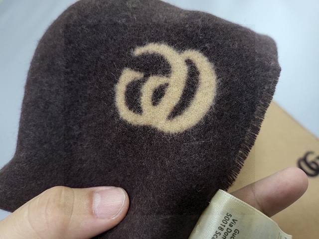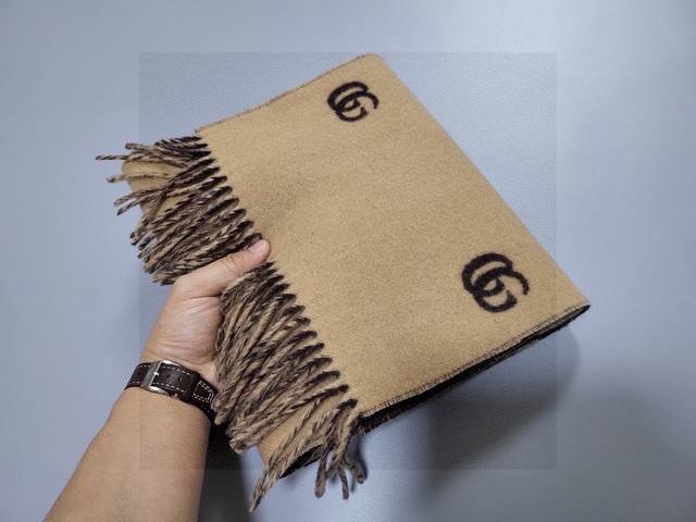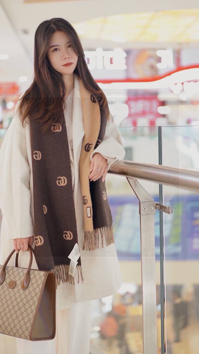 Never seen this before, right? Very few people have seen this scarf in stores. When it was released, very few were available in mainland China. The original was bought by a customer from a secondhand store in Japan, so it's a rarely circulated style. You definitely won't see someone else wearing it. Let me briefly introduce the scarf's weaving process. This scarf uses a traditional double-sided jacquard weave with a third-structure knot. The warp and weft density reaches 270 x 360. This high weft density makes the colors on both sides of the scarf very pure. In plain terms, it means the colors won't show through, right? So the colors are a classic camel and brown. The raw material is 20S 1 wool yarn, Yanchi lamb wool, with a fineness of 16.9-17.2