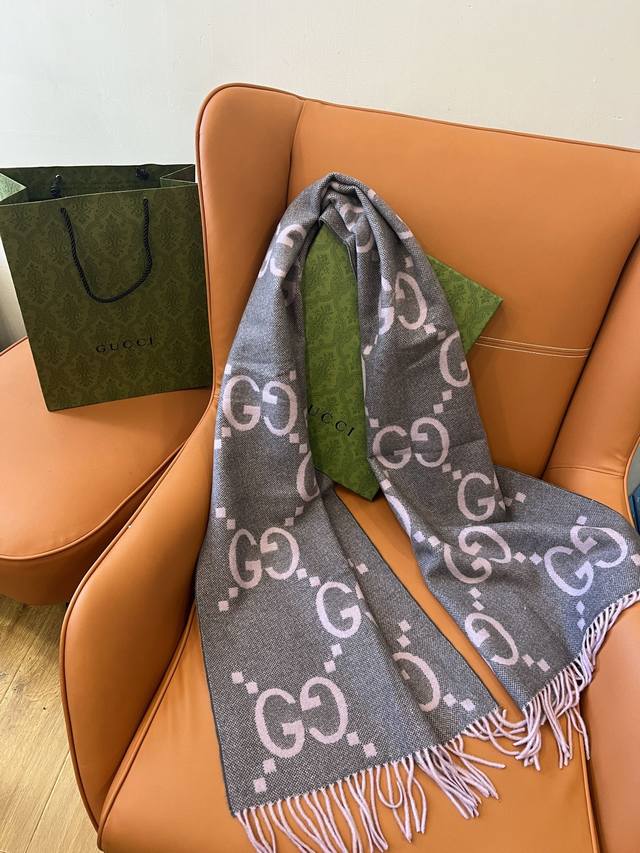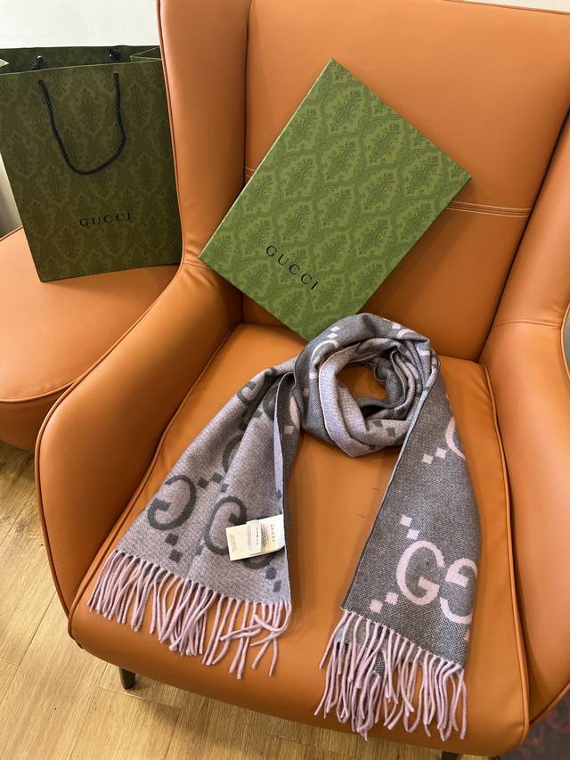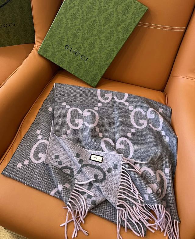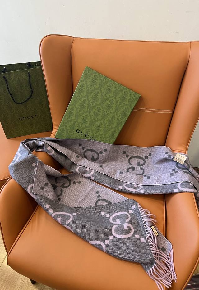 New Big G Double-Sided Cashmere Scarf in Pink and Gray Size: 45*200cm 100% Cashmere A rare pure cashmere product from G! Extra-heavy weight, top-grade cashmere, stylish Big G jacquard pattern, original product, absolutely premium! Two-sided color matching: One scarf can be worn in two ways - the same style for both men and women, the large shawl is practical and a great choice for business trips and travel!