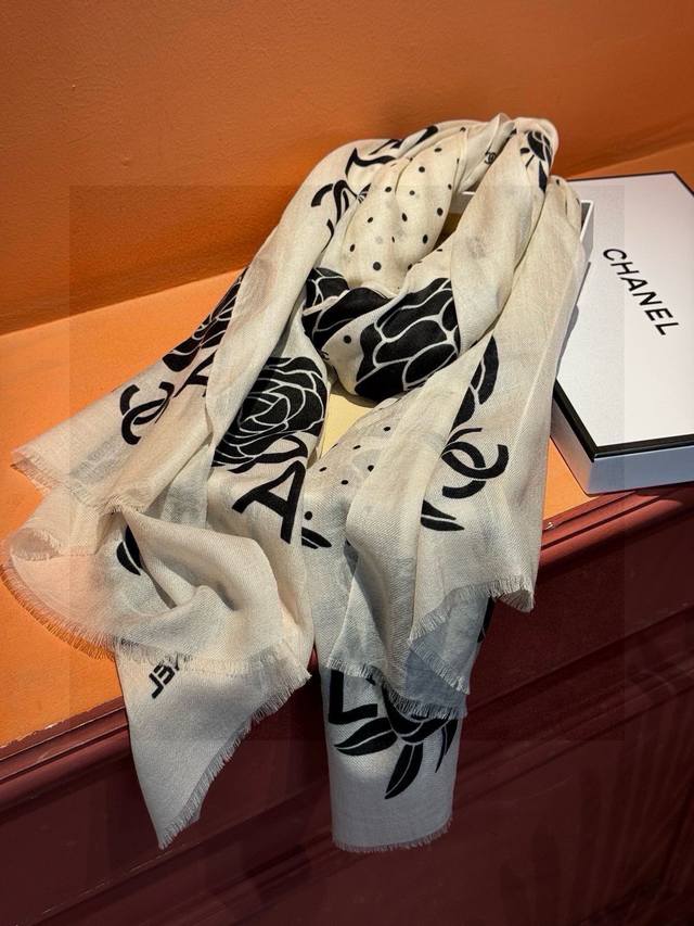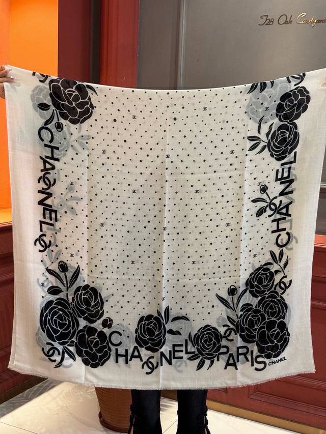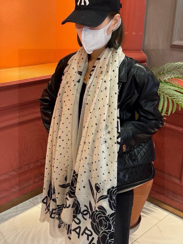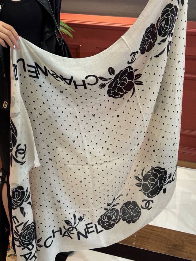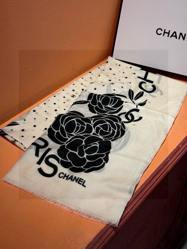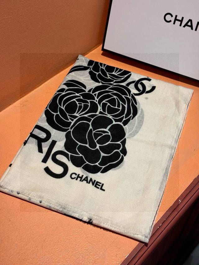 New Cashmere Camellia Long Scarf - Super flattering! Sophisticated and feminine! Cashmere scarves can be this beautiful!!! This double-sided floral cashmere scarf is truly luxurious! The signature Chanel floral pattern complements outfits beautifully! A new fusion of the signature camellia and double C letter elements, exuding luxury and elegance. The thin cashmere feels wonderful, and the print design is truly amazing! Perfect for spring and summer with a white shirt for a chic and stylish look, and for autumn and winter with a coat for a sophisticated touch. A must-have for fashion-conscious women!! Soft, smooth, and supple! Makes the scarf easy to style. A very luxurious design, yet it brings out a uniquely elegant and sophisticated aura! Pair this scarf with a simple base layer for a comfortable and tasteful high-end look. Highly recommended!! Size: 100*200cm Cashmere Long Scarf