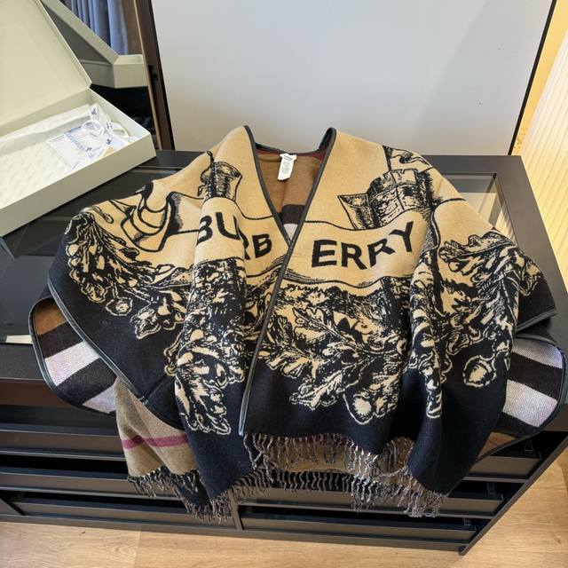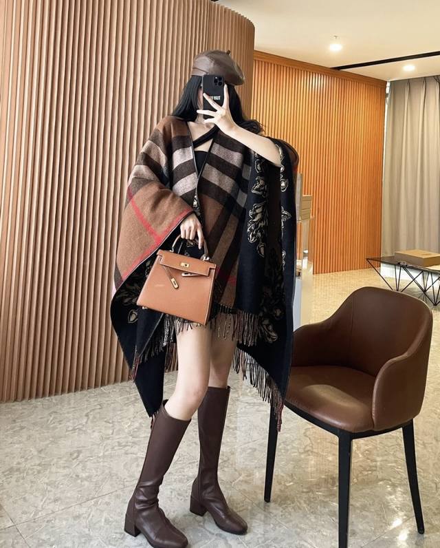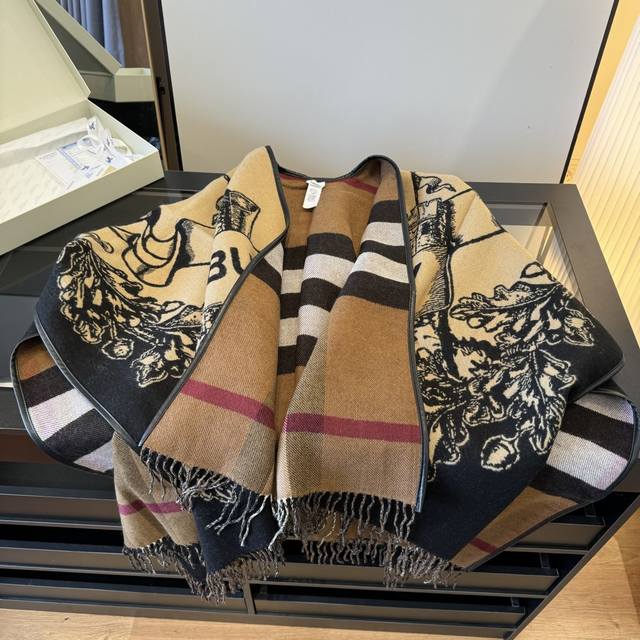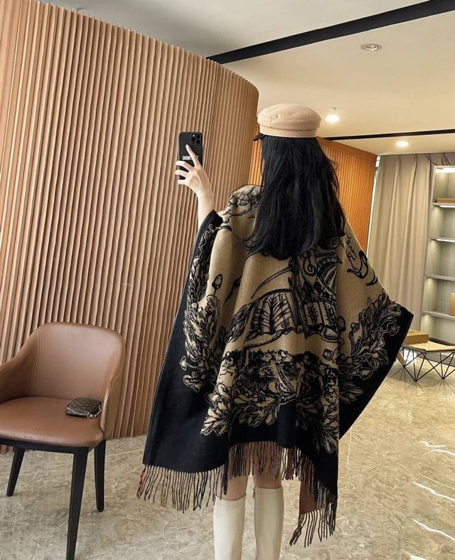 New War Horse Reversible Cape in Maillard Color DDD 130X155Cm 100% Cashmere DDD A must-have winter cape! Exquisite lambskin edging - two-sided style: one side features a war horse embroidery pattern paired with the other side's classic plaid. This innovative design is more unique than a simple plaid logo. The Maillard color perfectly captures the autumnal atmosphere, making it versatile and youthful DDD