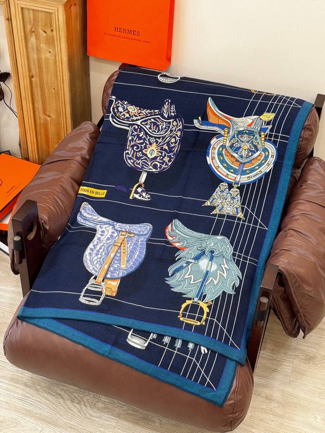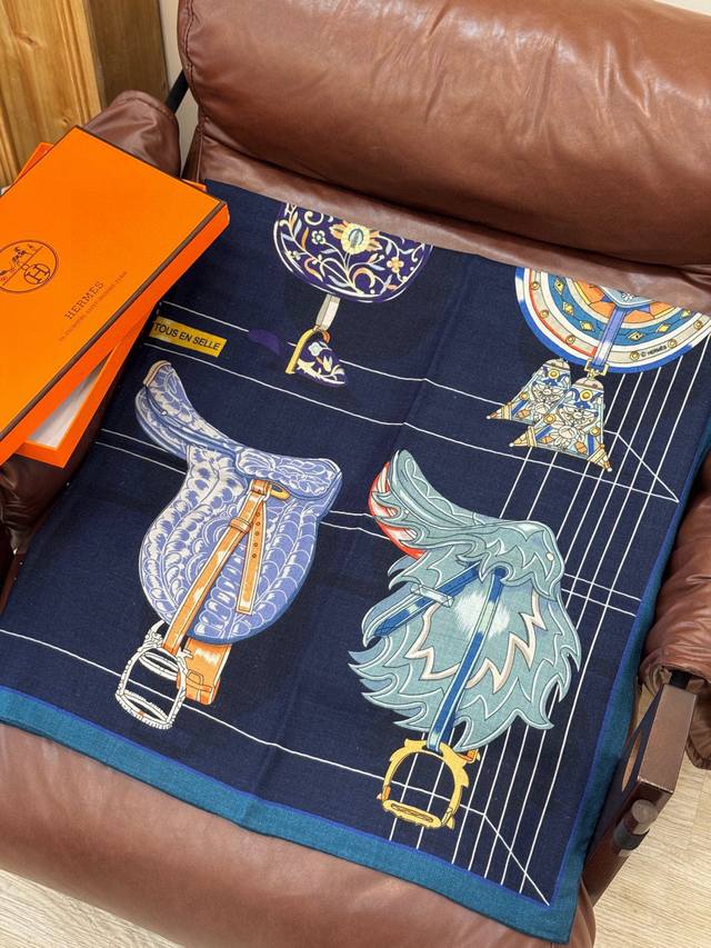 "Saddle World" 140mm silk and wool square scarf, double-sided, same color.