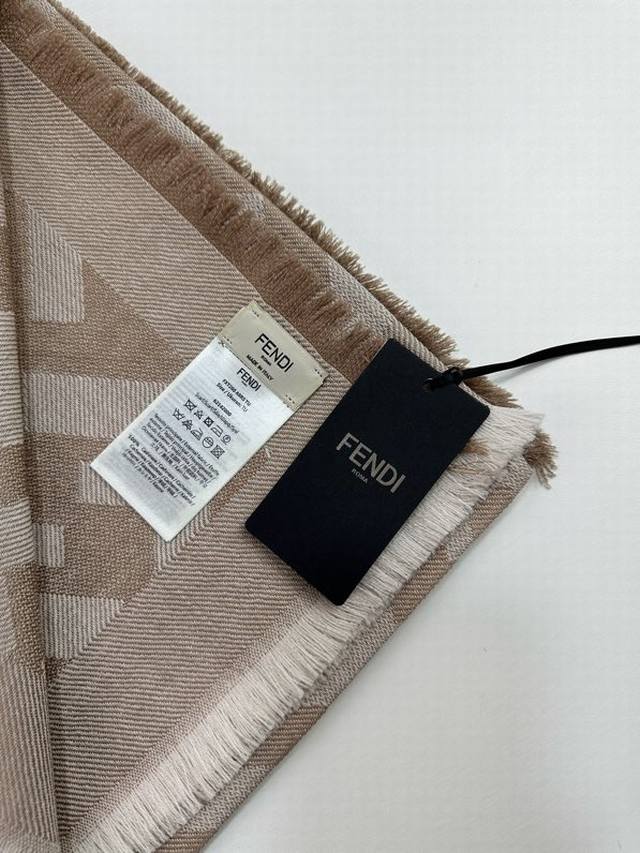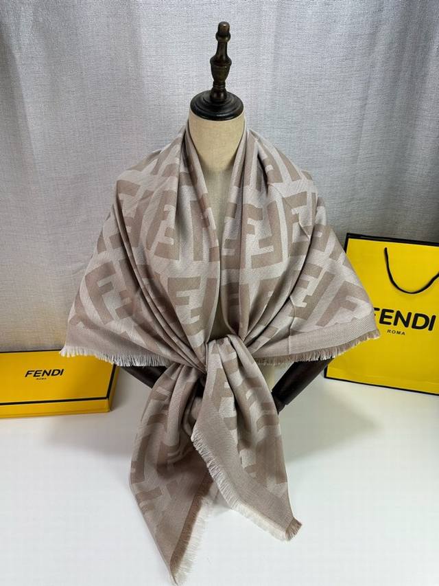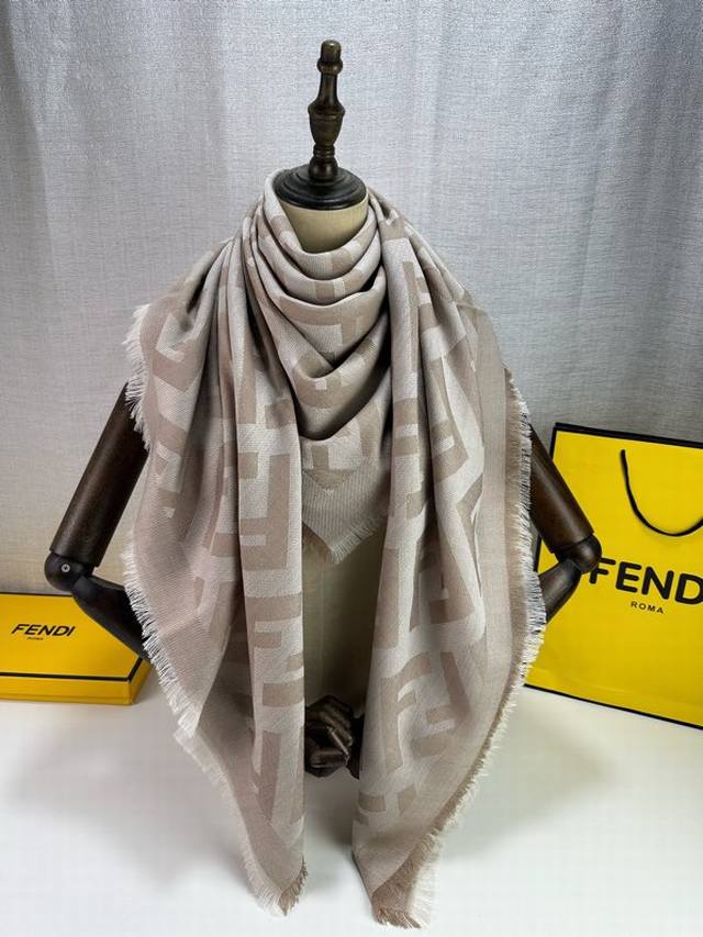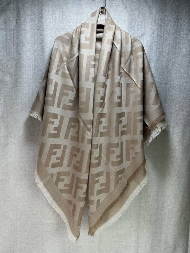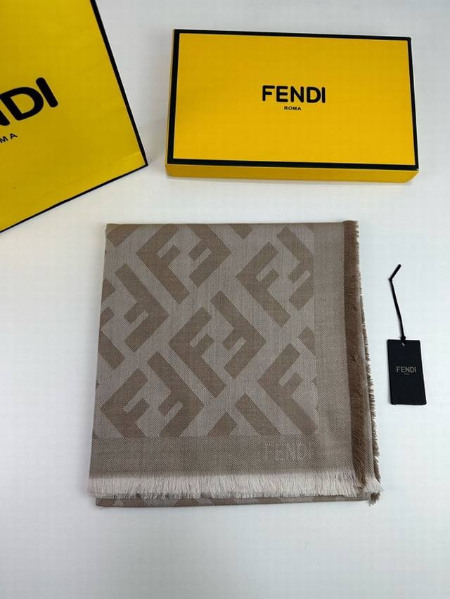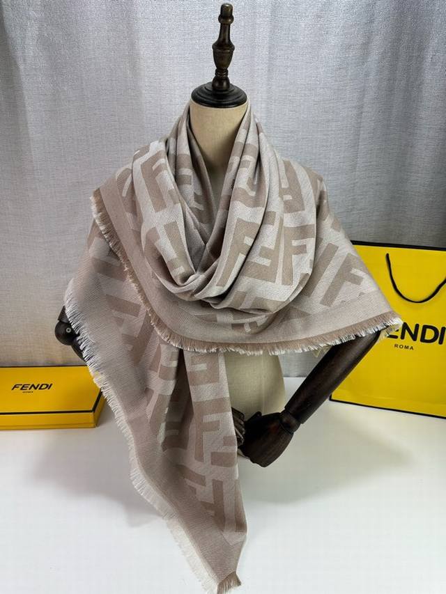 jacquard weave, adorned with the classic Ff logo, presenting a denim effect. Hand-finished raw edges. Material: 90% wool, 10% silk. 140 x 140 cm.
