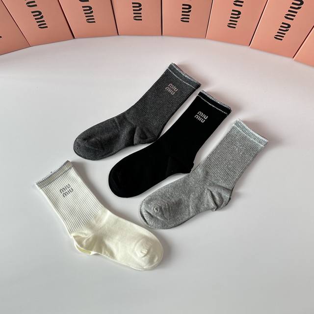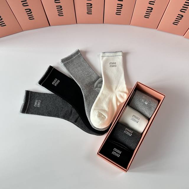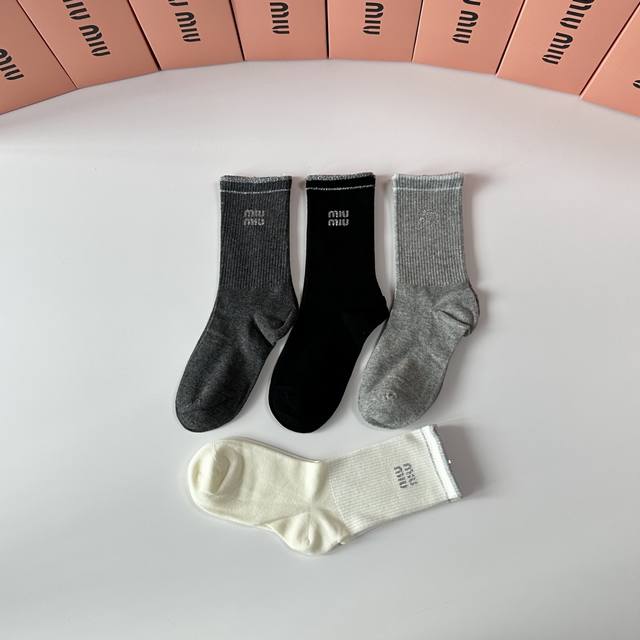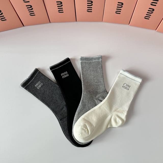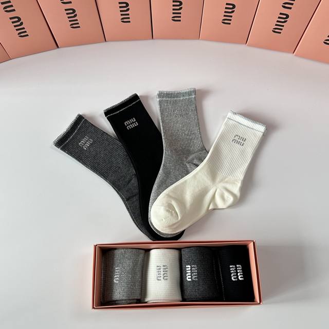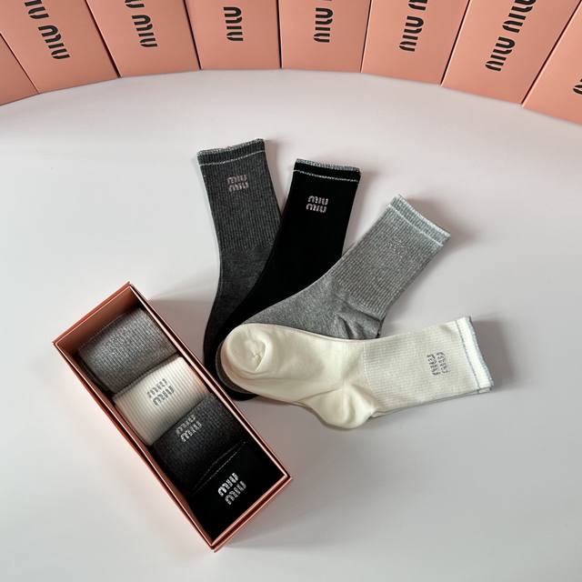 Miumiu New Style Heat-Printed Classic Mid-Length Socks! Four pairs per box, same style as in department stores, designer street style, a must-have for trendsetters, super easy to match.