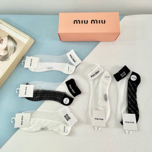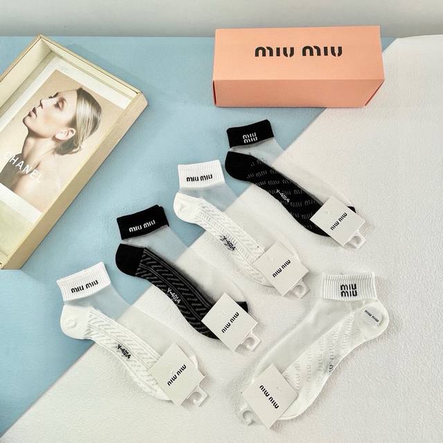 Special Packaging One Box Of Five Pairs Miu Miu New Short Ice Silk Socks Ice Silk With Cotton Lining, Lace-Up Classic Letter Logo, Lightweight And Breathable, A Must-Have For Hot Summer Days, Feels Cool When Worn, Extremely Soft Material, Same As Those Sold In Stores, A Super Popular Item On Instagram, Perfect For Street Style,A Must-Have For Fashion-Forward Individuals, Incredibly Versatile.