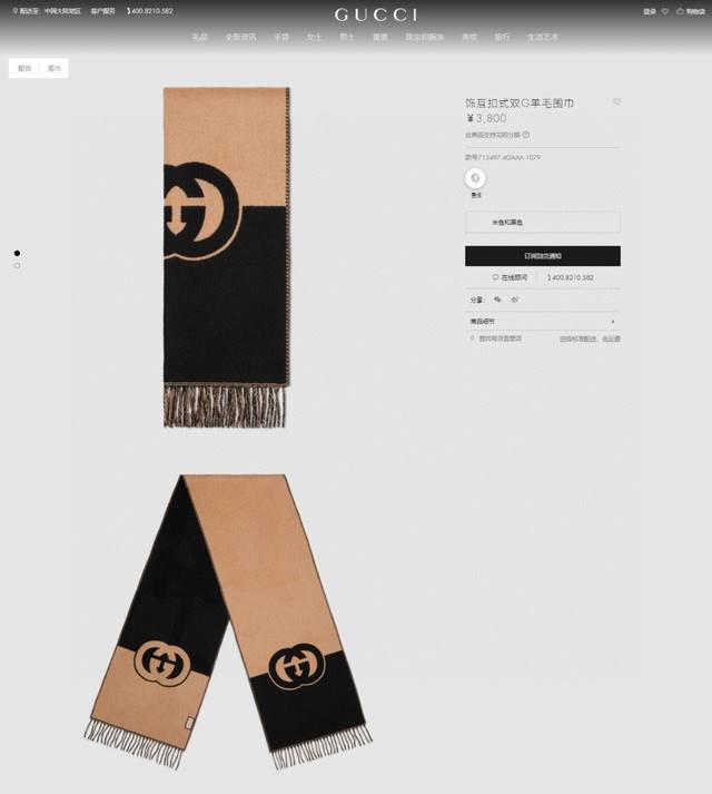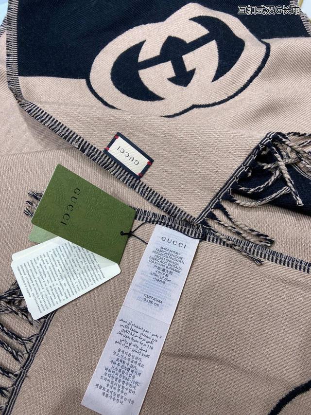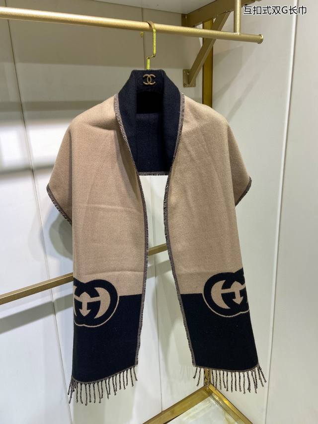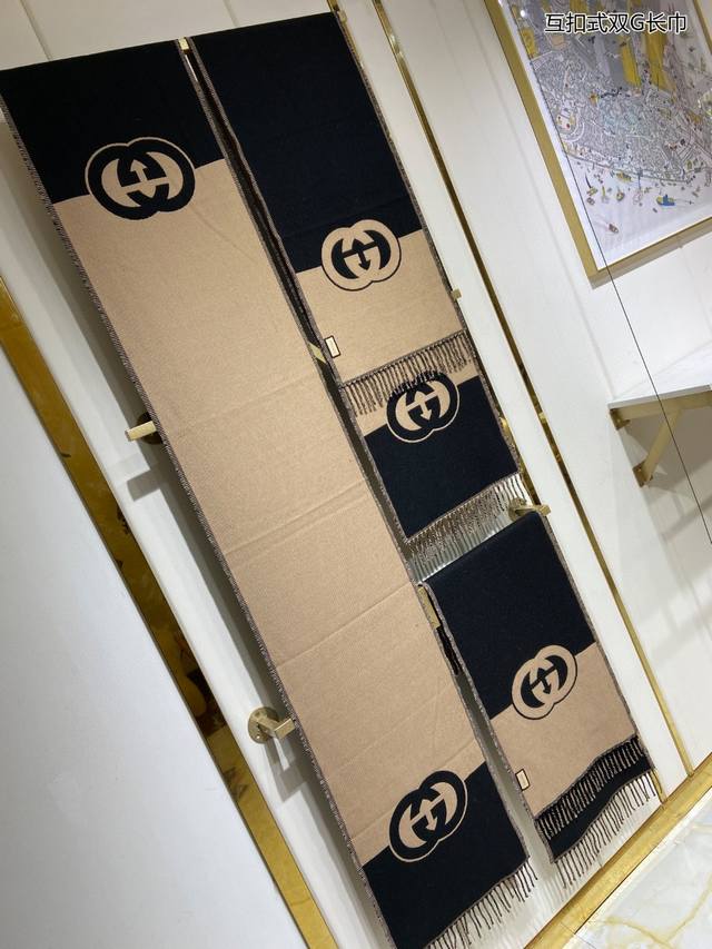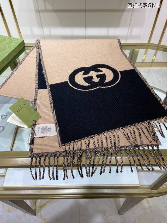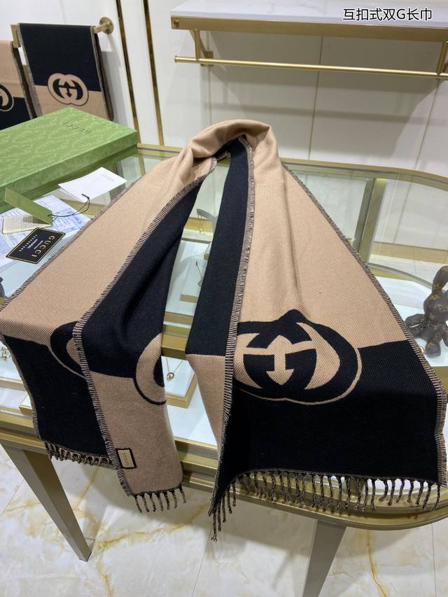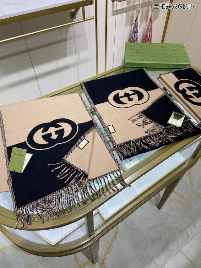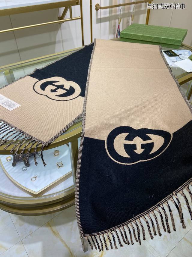 This hot-selling Interlocking G scarf features a classic double-sided, two-tone design. This iconic pattern is reinterpreted each season, creating a fresh and elegant double-sided, two-tone contrast. The style and color are suitable for both men and women, with a soft feel and beautiful colors. It features fringe trim, 100% wool, and measures 33 x 200