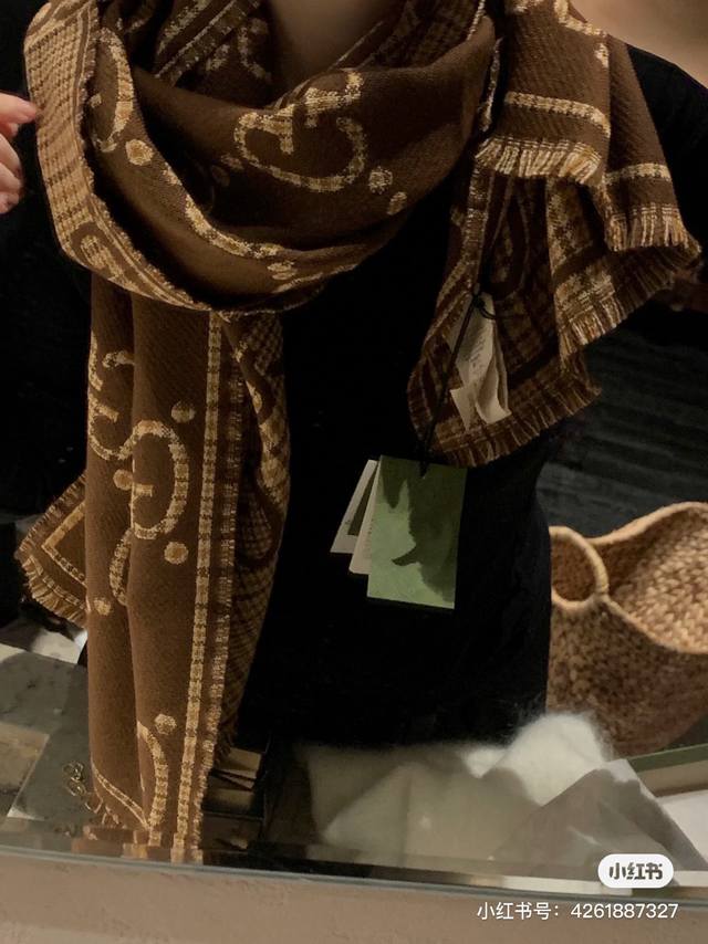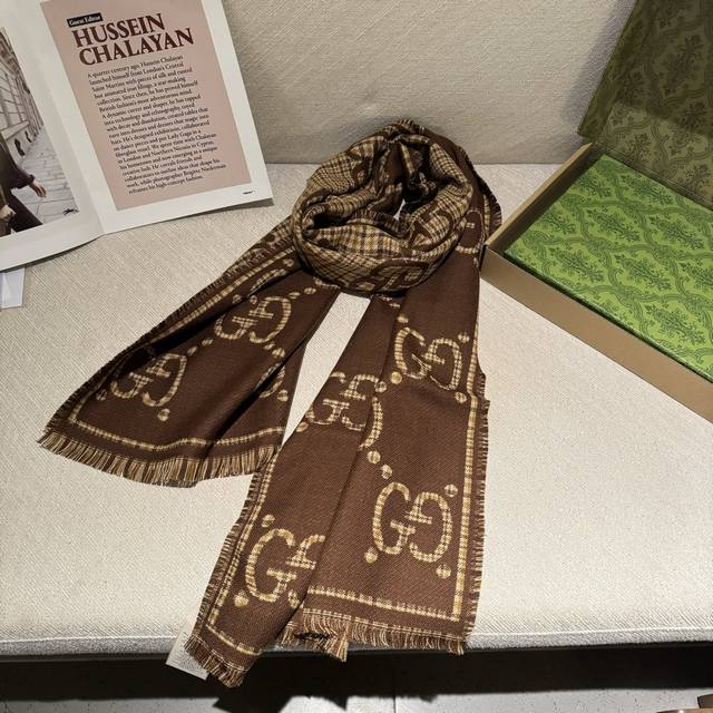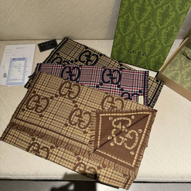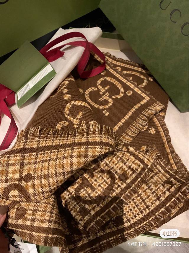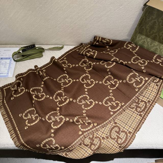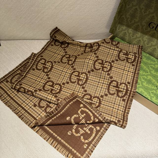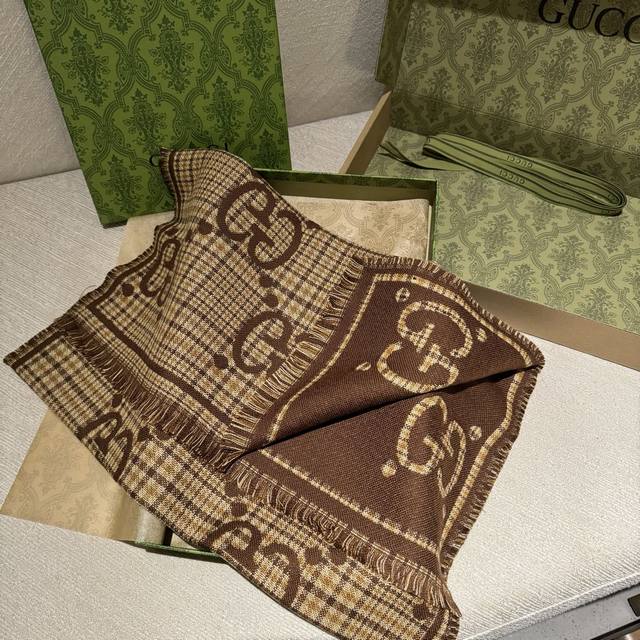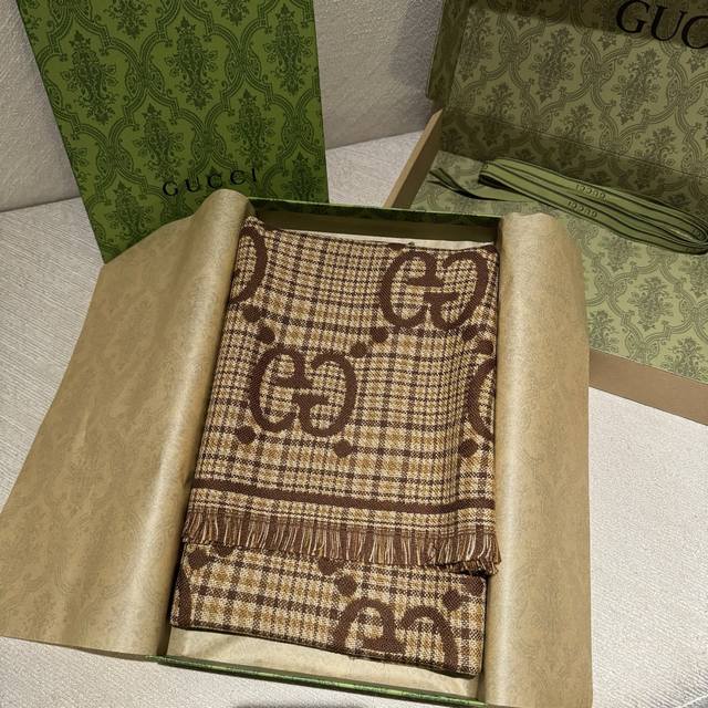 This is a classic, stylish, and timeless double-G jacquard shawl, identical to those in boutiques. It looks great anytime. Suitable for both men and women, this limited-edition Gucci shawl with classic elements is a truly luxurious and high-end scarf that elevates your style. It adds a touch of sophistication to your overall look, instantly transforming your style. The high-density lettering is incredibly clear. The fabric is the same as in boutiques, 100% wool, soft, silky, and substantial