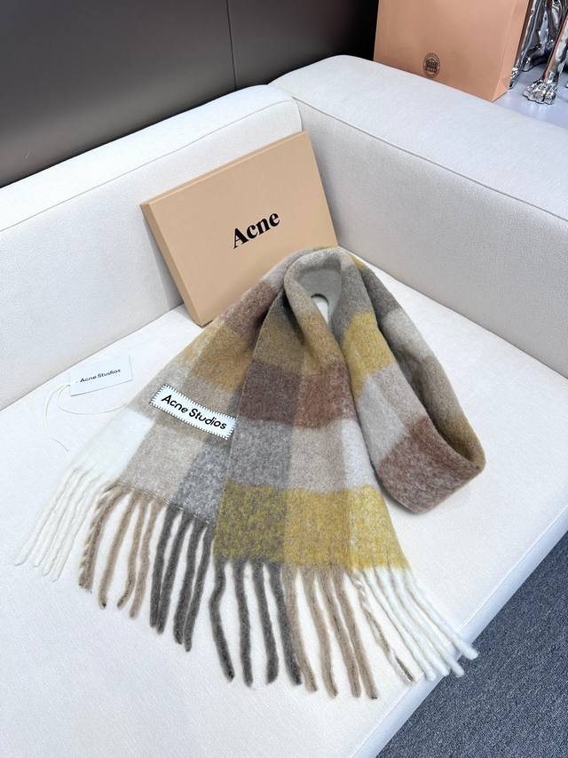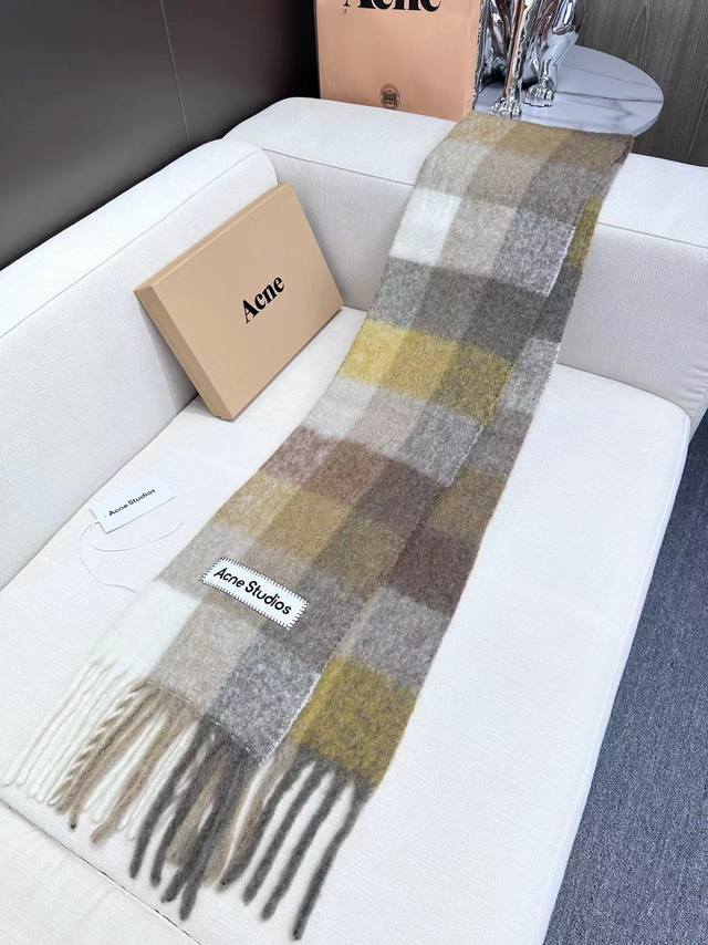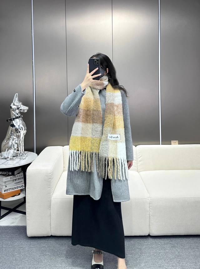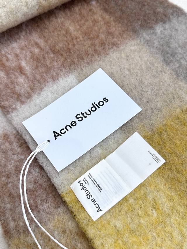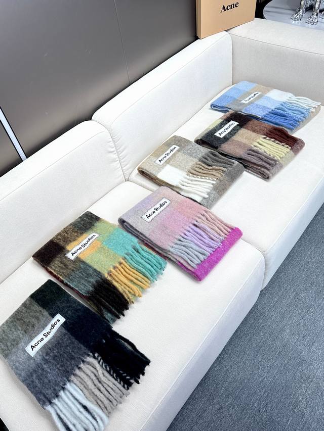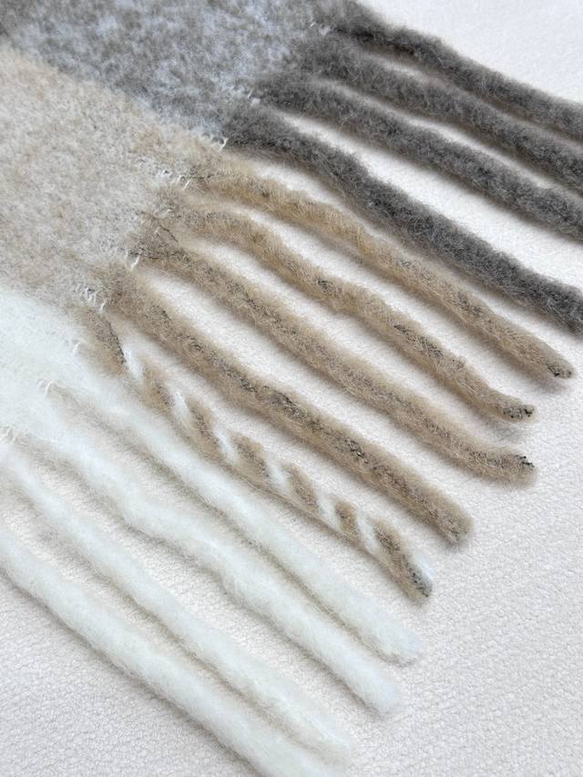 This year's hottest item has arrived! Original factory overrun, Acne's new alpaca and mohair rainbow scarf, the warm colors of Stockholm! Love at first sight, super high-value design! Dreamy color scheme, outshining all other versions on the market, truly original factory overrun. Acne scarves always surprise. The classic "Valley" oversized version originated in Italy, incorporating warm Nordic color blocking, super versatile, immersed in various color palettes. In winter, you can bury your head in this big scarf, super warm! High coverage, makes your face look smaller! Mohair with wool content, the fabric is crisp and comfortable, the thick tassels are as cute as shrimp chips! The hand-stitched oversized logo is exceptionally exquisite and surprising! Specifications: 28*250Cm, Composition: 33% alpaca, 25% wool, 22% nylon, 20% mohair.