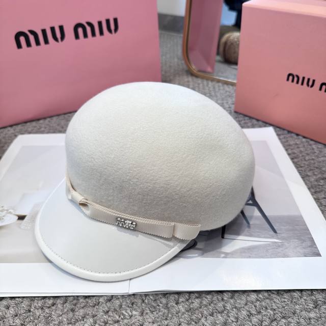 White Miumiu new bow woolen fabric for women, autumn and winter versatile, hot girl personality, small face, not picky hat type