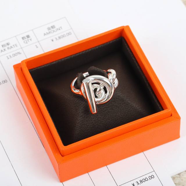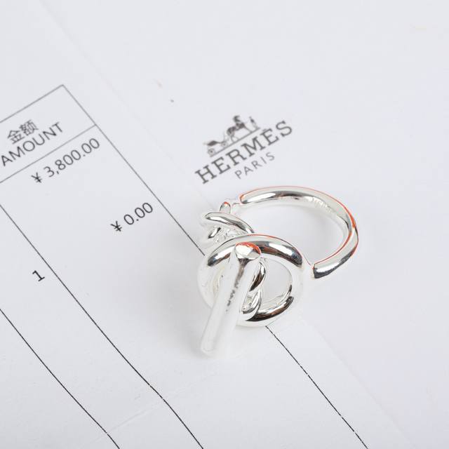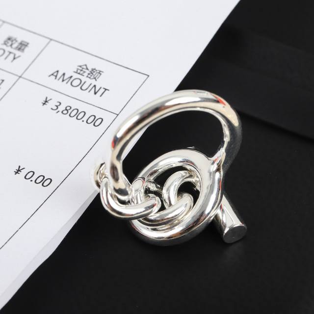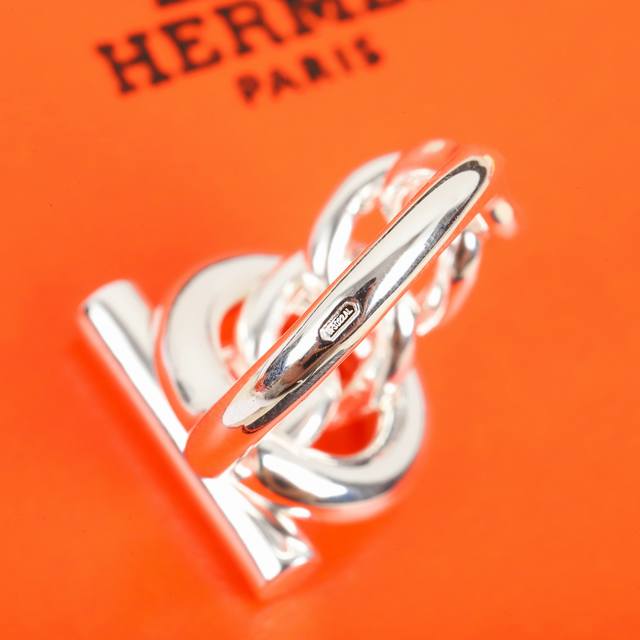 is the Herm=S Croisette sterling silver ring, a viral sensation on Instagram. It's incredibly heavy, weighing over 10 grams of silver, exactly the same as Zp7540, made of 925 sterling silver. The craftsmanship is superb and perfect; you could practically sell it as a genuine Zp. It's very unique; the chain can be slightly movable, but the ring size is fixed. Therefore, the development of the craftsmanship was extremely challenging. After half a year, we finally developed it. Another feature is the steel stamp on the outer ring band. As you all know, developing a steel stamp costs close to 10,000 RMB, and the stamp, when magnified, also reveals the ring's serial number. In stock, please cherish it .