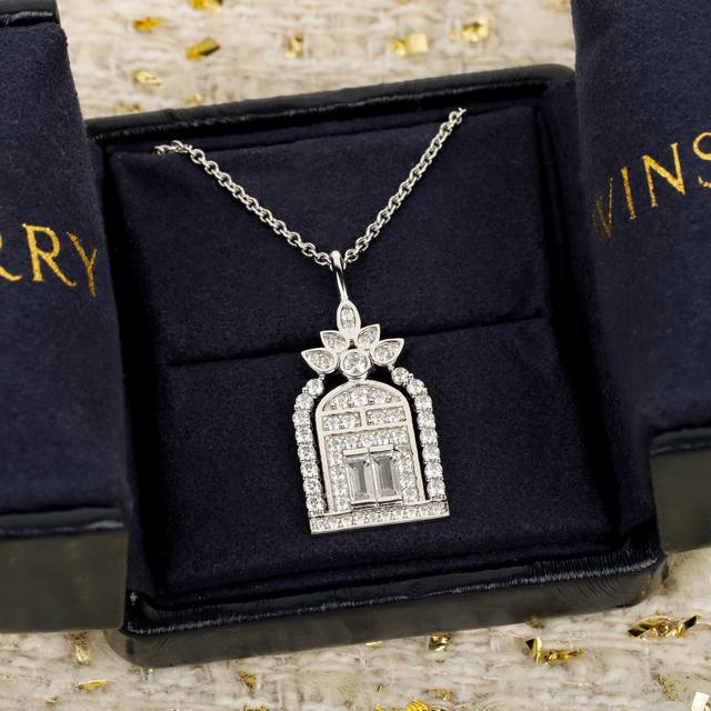 This unique, everyday piece pays homage to the brand's illustrious history and precious heritage. Inspired by the entrance to Harry Winston's New York flagship store, this Gates pendant features round brilliant-cut and baguette-cut diamonds, reimagining the iconic Fifth Avenue landmark. Crafted entirely from 925 silver, it offers exceptional color retention.