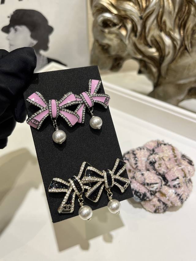 25B New Double C Black and Pink Enamel Bow Pearl Pendant Earrings DDD Black enamel earrings with sequins, perfect match DDD Classic black and gold color scheme is very flattering and gets more beautiful the more you look at them~ DDD The overall ambiance is all thanks to these earrings. The large size is very eye-catching DDD