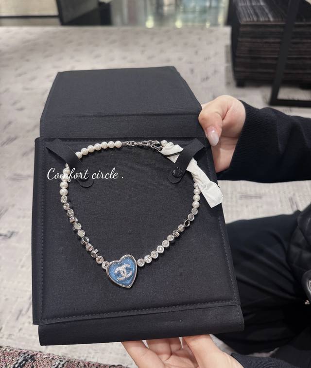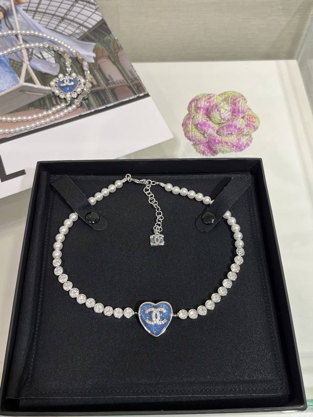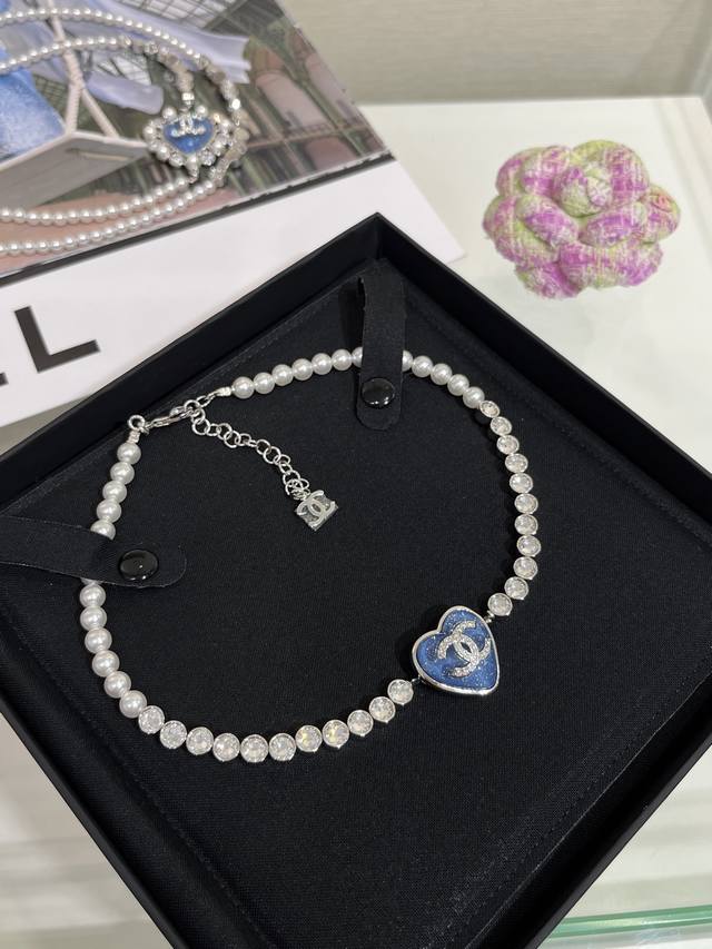 / 25p Blue Heart Silver Full Diamond Double C Pearl Necklace The design of pav