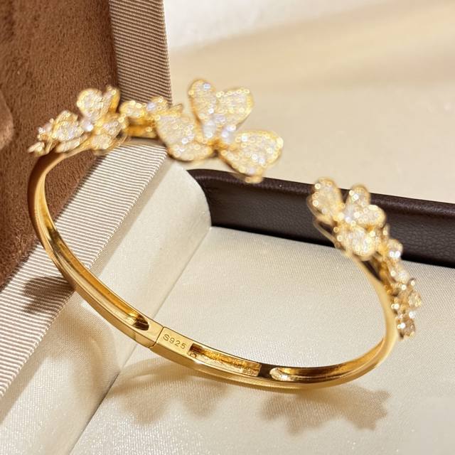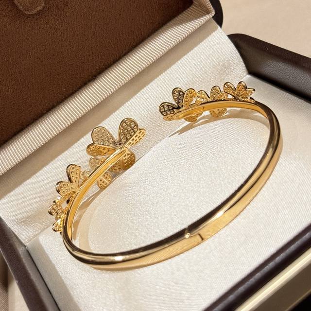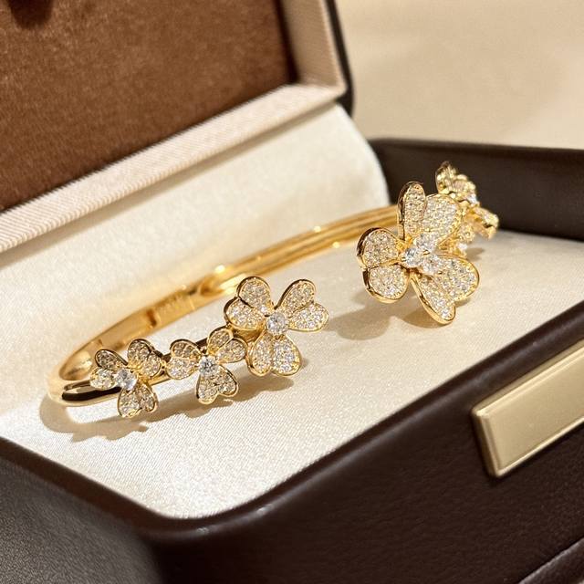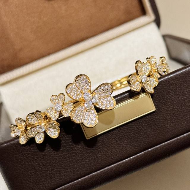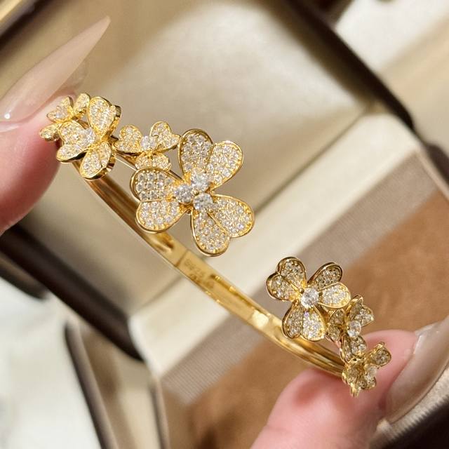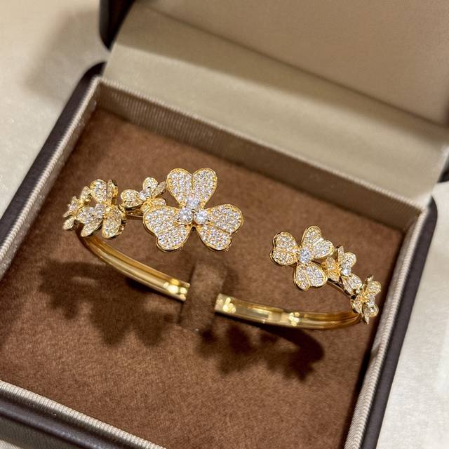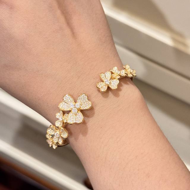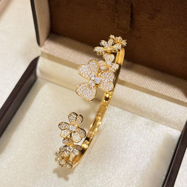 A2335 Van Frivole series clover full diamond open bangle, the highest version custom-made 925 sterling silver inlaid with thick gold material, is extremely exquisite. Regardless of the appearance, shape, or back distribution, every effort has been made to reproduce each piece, making it very difficult to produce. Elegant, high-end electroplated rose gold sterling silver bangle.