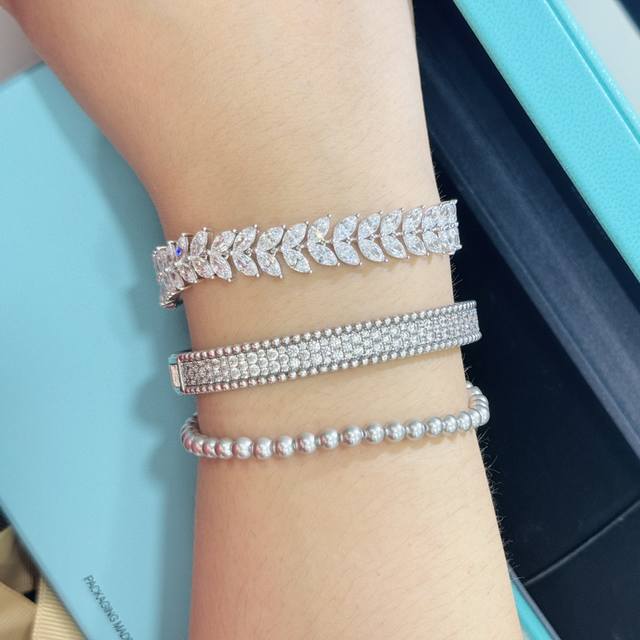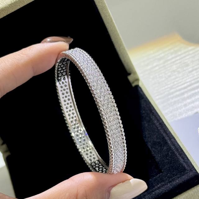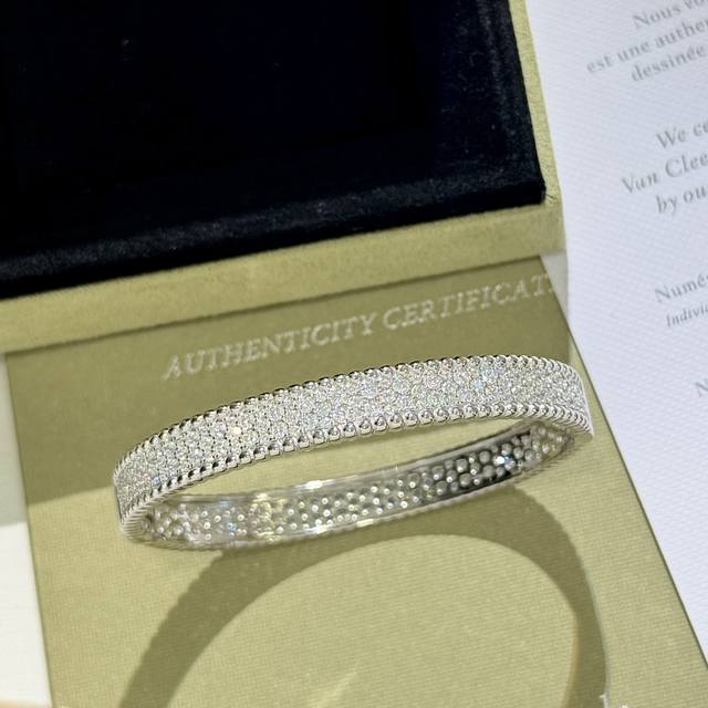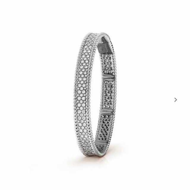 A4284 Fanjia wide bracelet with full diamonds and beaded edges. A stunning piece. Made from German imported S925 sterling silver with thick gold plating. Non-fading and non-allergenic. A must-have platinum sterling silver bracelet.