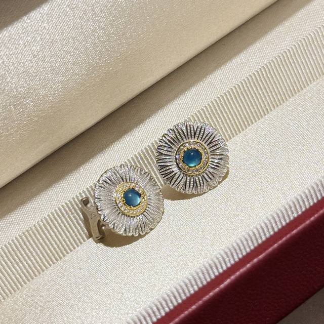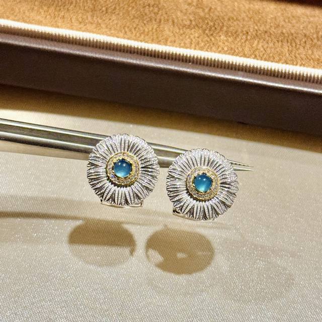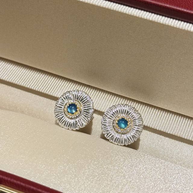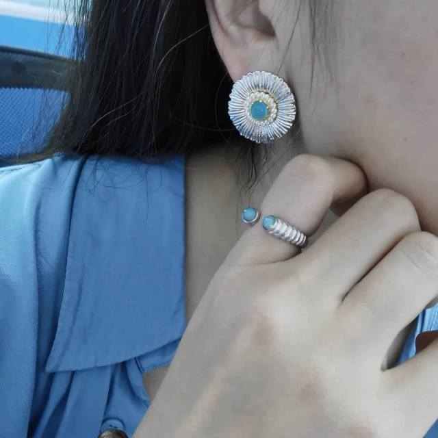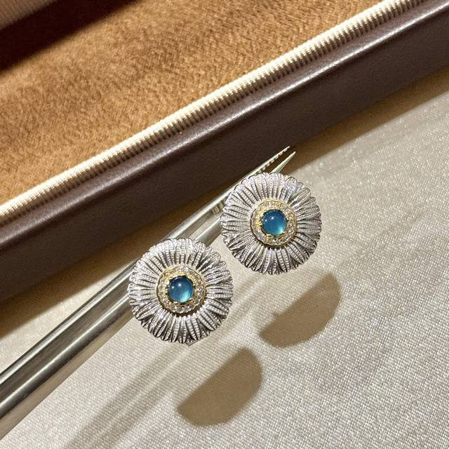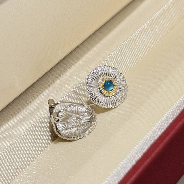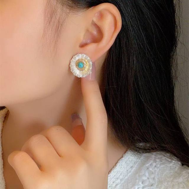 A6295 Popular Vintage Aquamarine Sunflower Frosted Earrings - Retro and Romantic. Every time you wear them, it's a dialogue with time. The daisies on the earrings are delicate and vivid, as if they are quietly blooming. Each petal is carefully carved, exuding a retro feel, making you feel as if you have traveled back to that poetic era. Two-tone electroplated thick gold and sterling silver earrings.