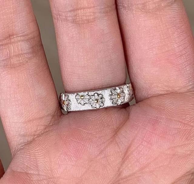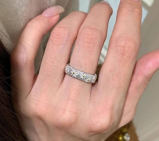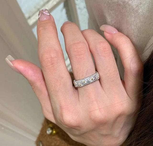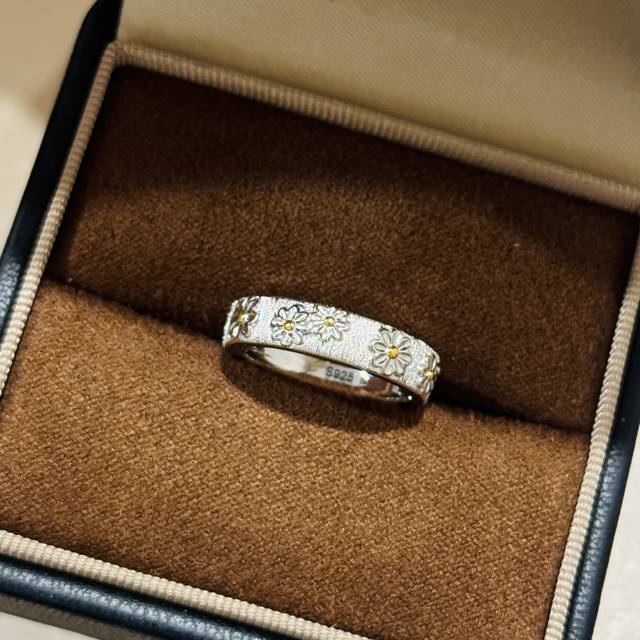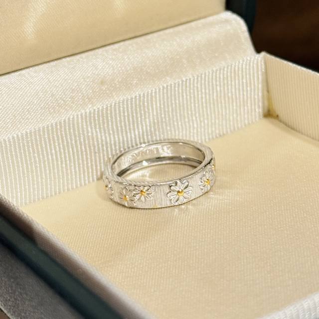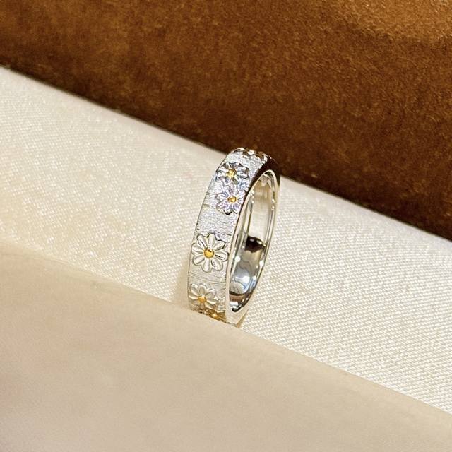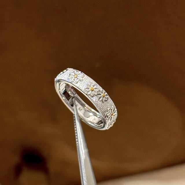 A6753 Butcher-style small daisy and small yellow flower brushed ring with frosted design, French all-match carving, popular Instagram style, all-body S925 sterling silver, sweet, fresh, light luxury, simple design, platinum gold electroplated thick gold, 678 yards full sterling silver ring