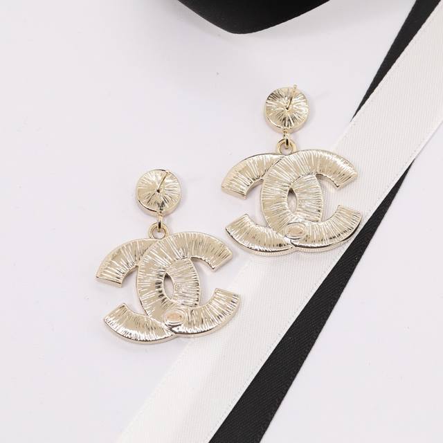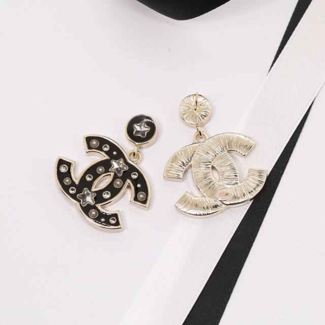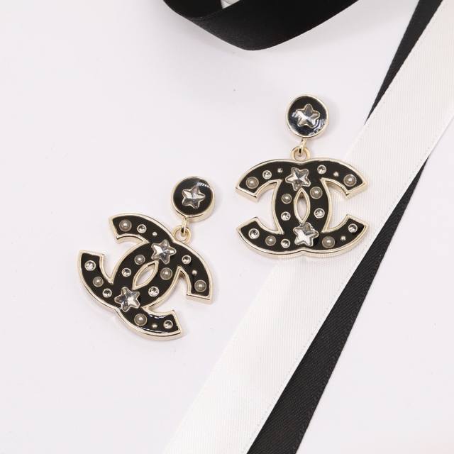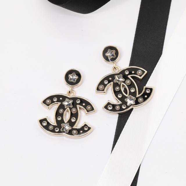 Ch Nel Earrings: Round black enamel star-shaped crystal pearl double C pendant earrings for women. DDD