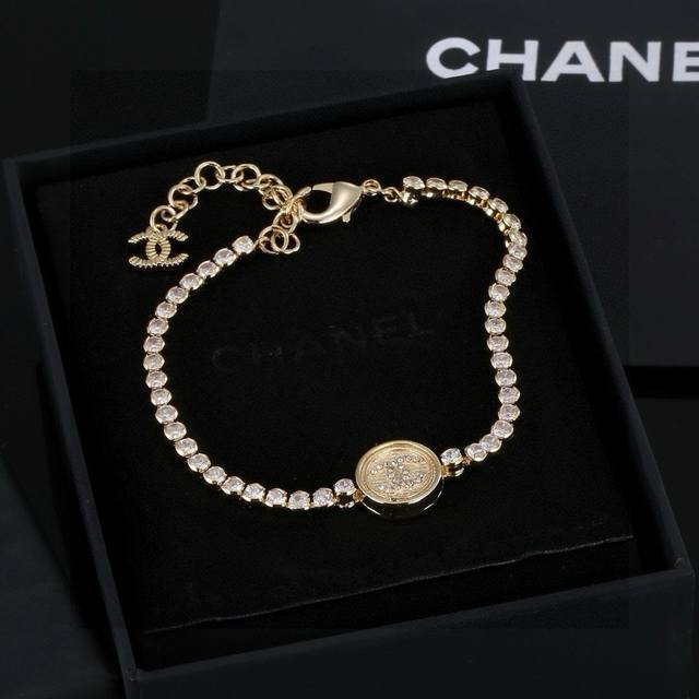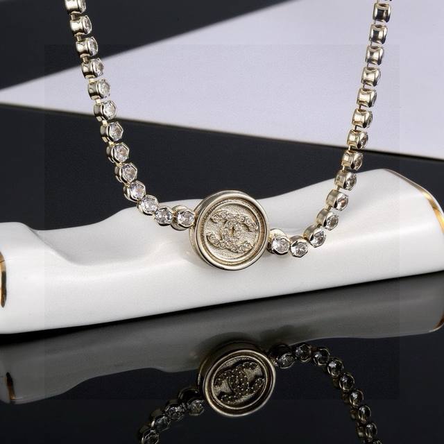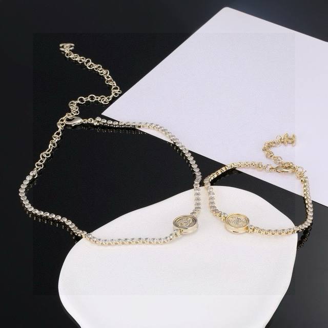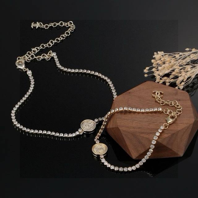 features a double C in light gold, paired with a circle, and connected by a single row of crystal embellishments. Simple and versatile, this necklace and bracelet