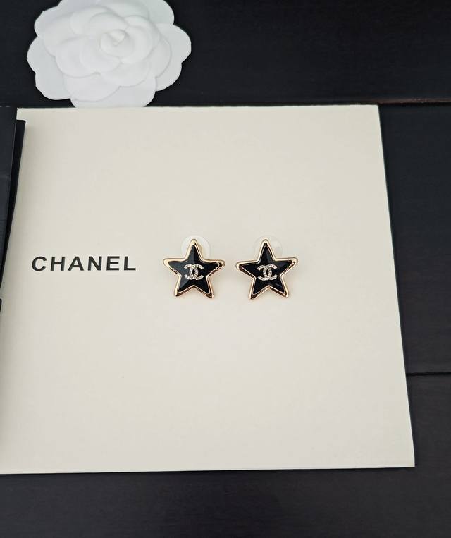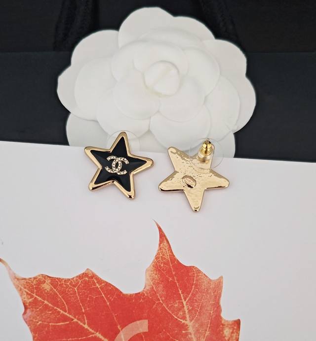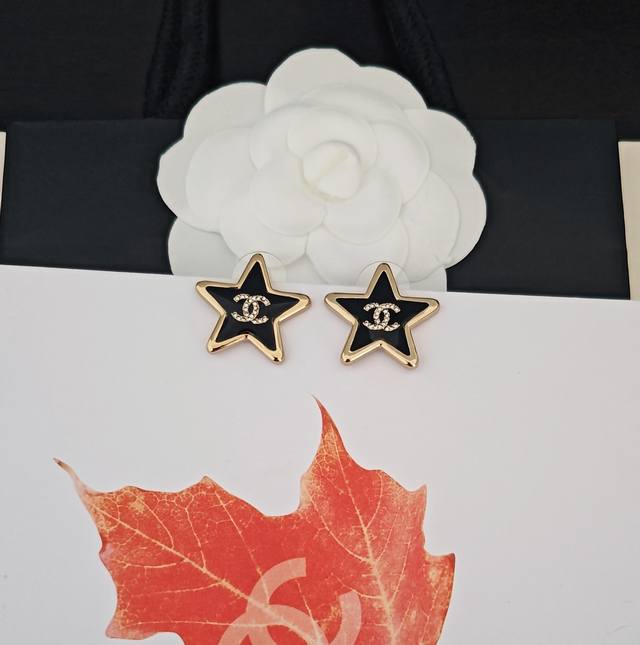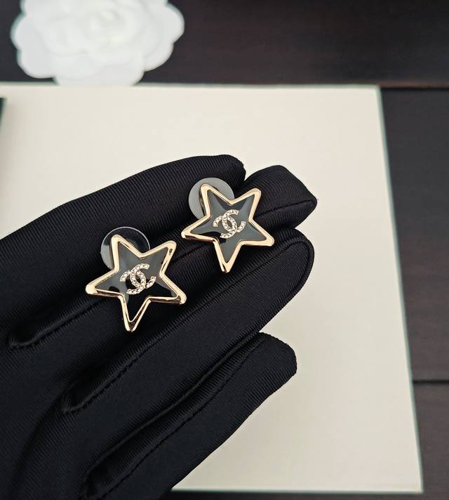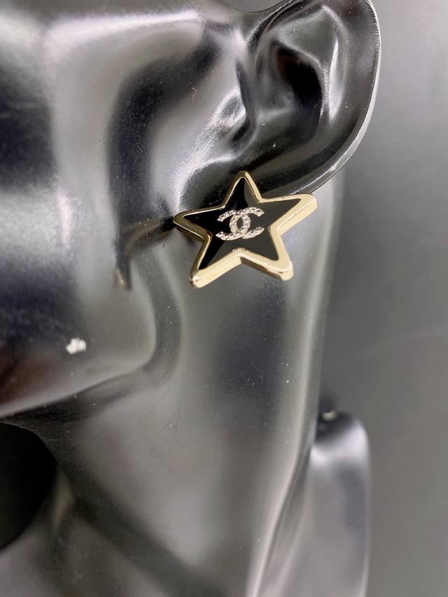 / Ch*Nel Latest Black Resin Five-Pointed Star Earrings, Same Style as Zp, Brass Ma