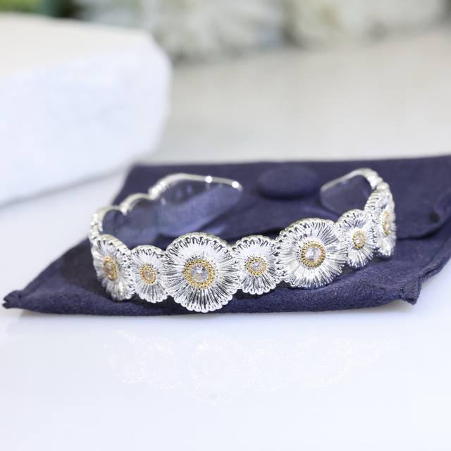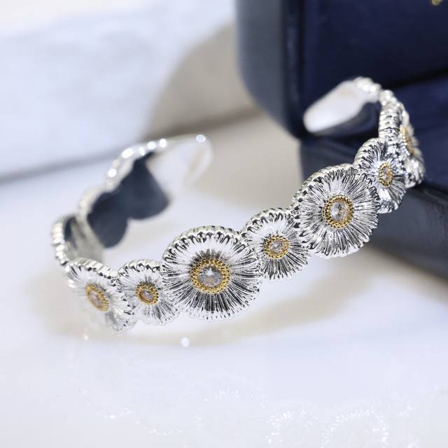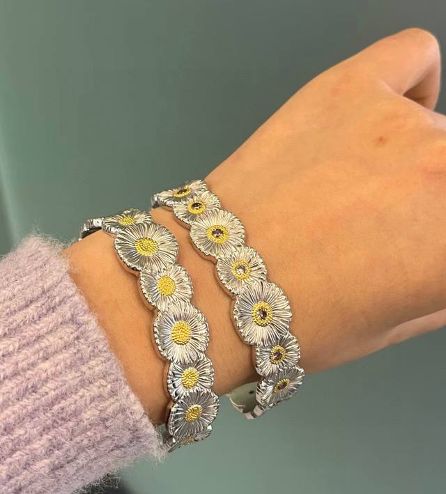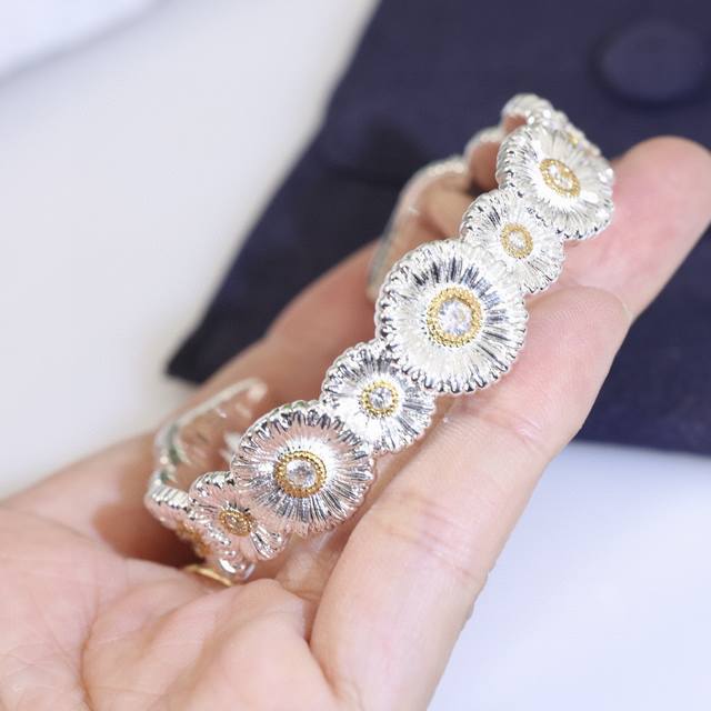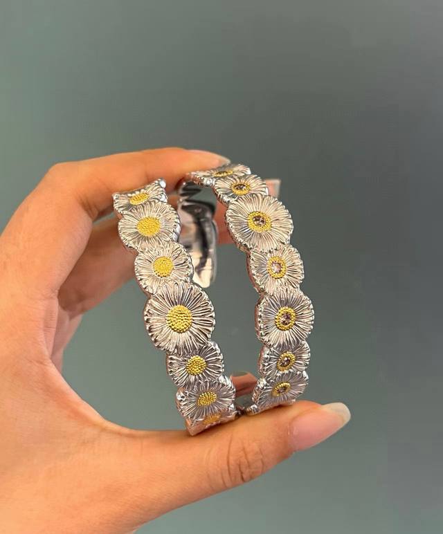 Daisy Bangle Buccellati, Italian High-End Jewelry Brand, Vintage Court Style Bangle, Made of 18K Thick Gold with Two-Tone Electroplating, High-Quality Buccellati Bangle, Sunflower Bangle. (