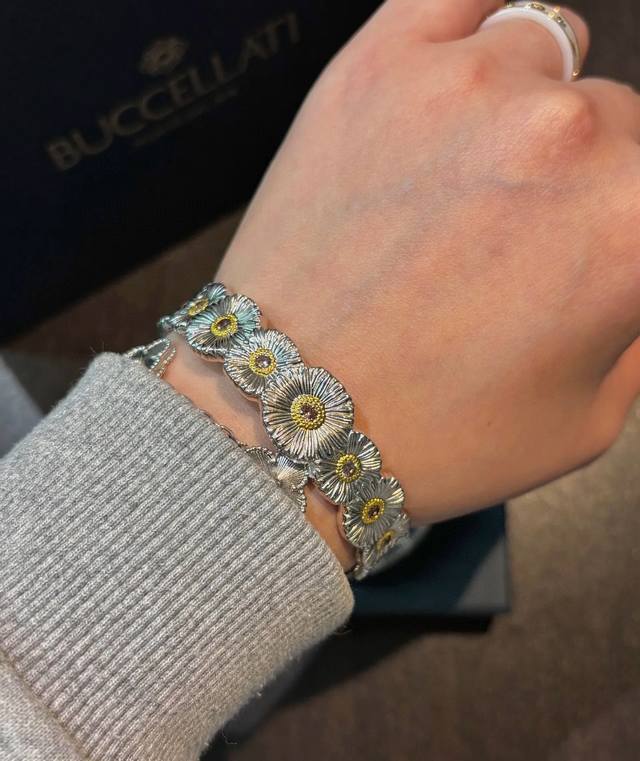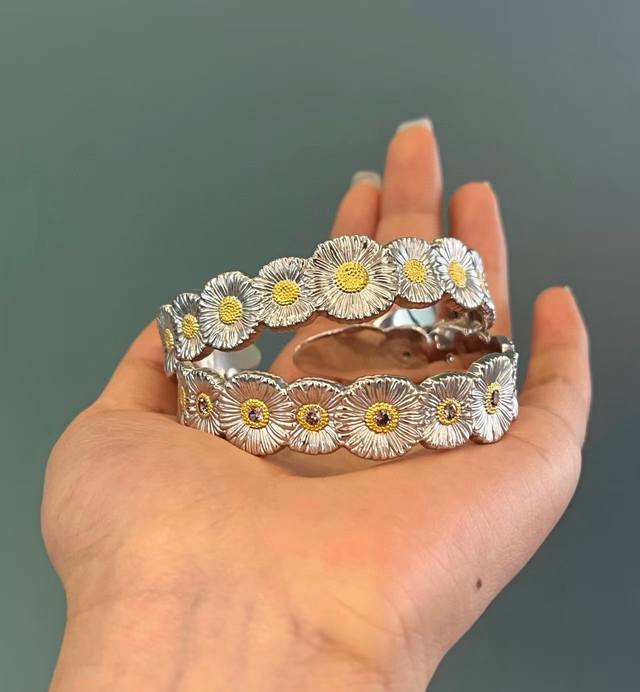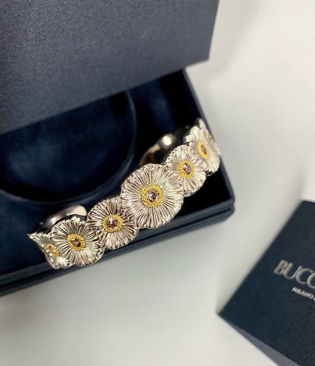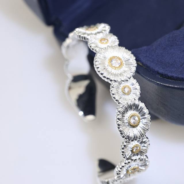Daisy Bangle Buccellati, Italian High-End Jewelry Brand, Vintage Court Style Bangle, Made of 18K Thick Gold with Two-Tone Electroplating, High-Quality Buccellati Bangle, Sunflower Bangle. (