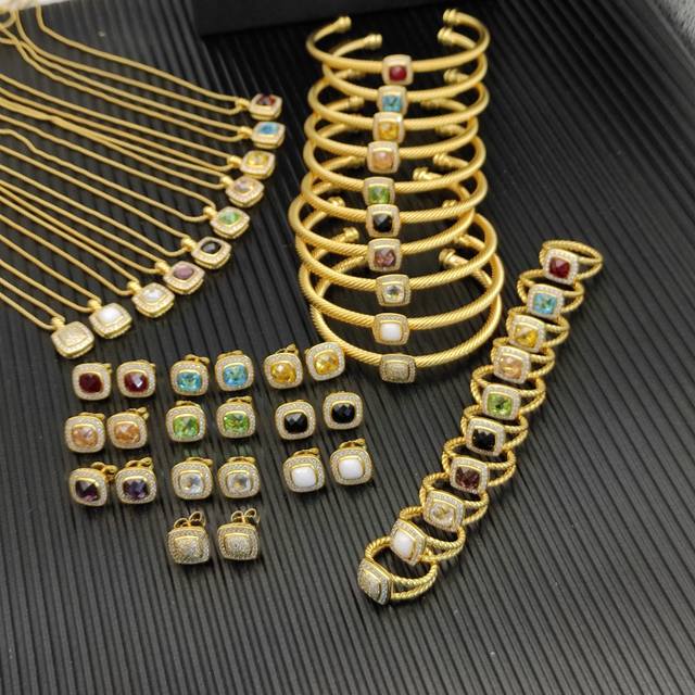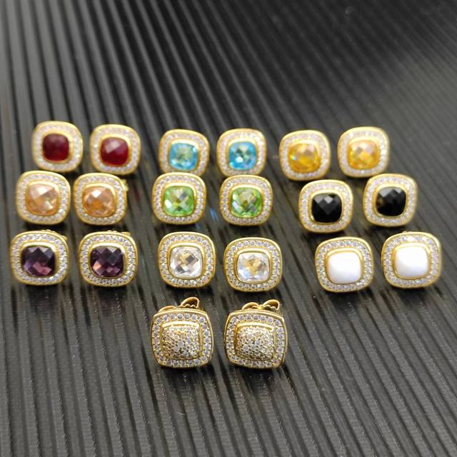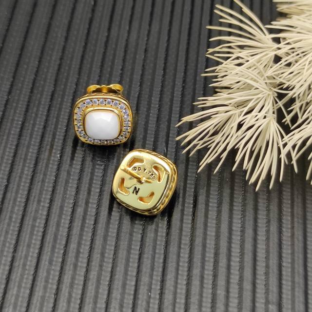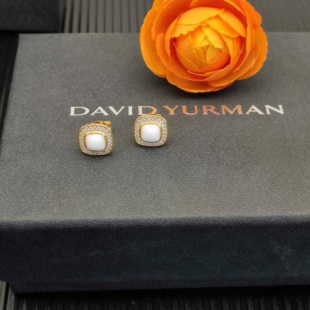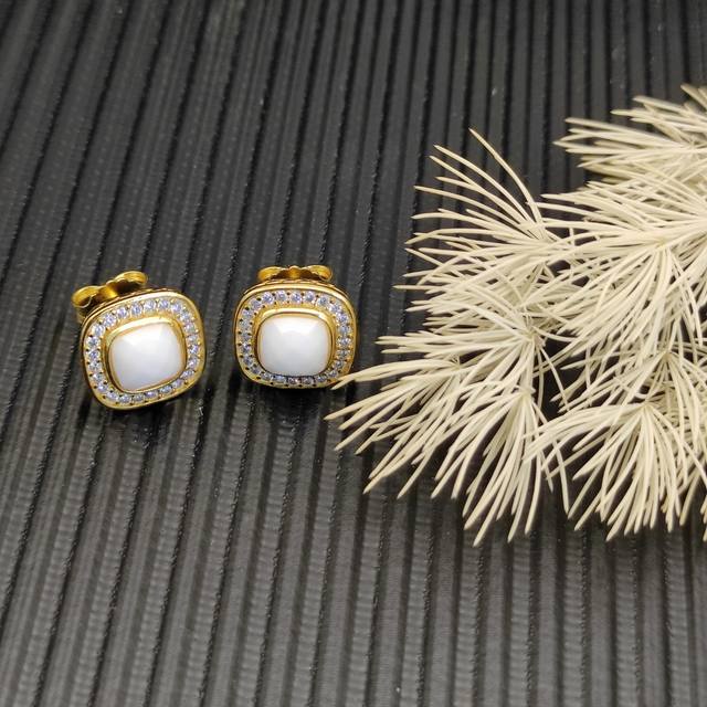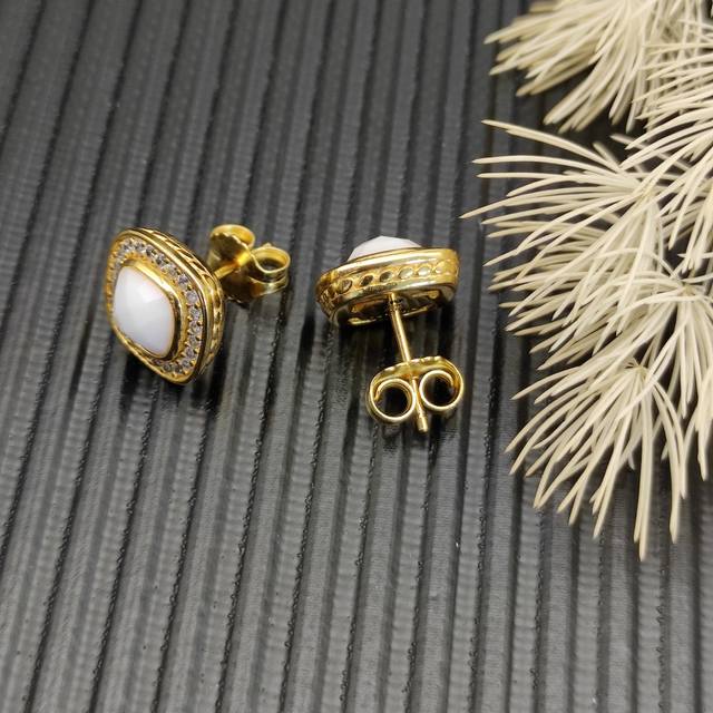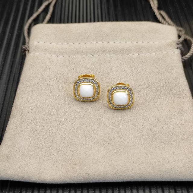 / David Yurman 7mm gold square diamond earrings with white agate