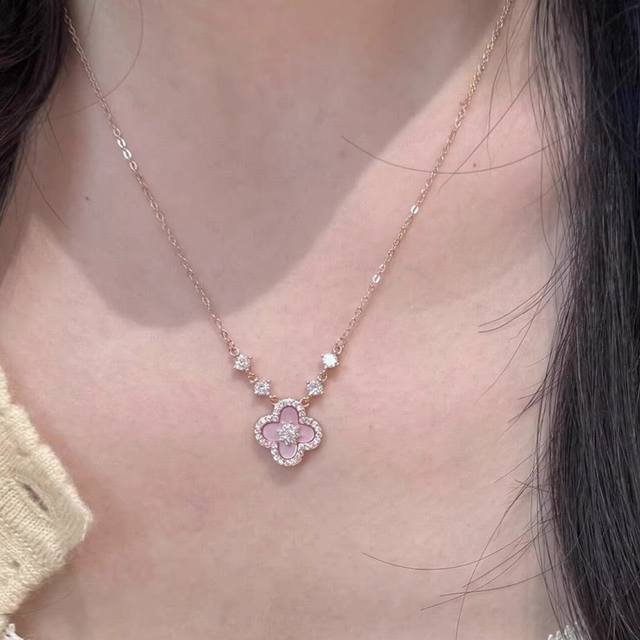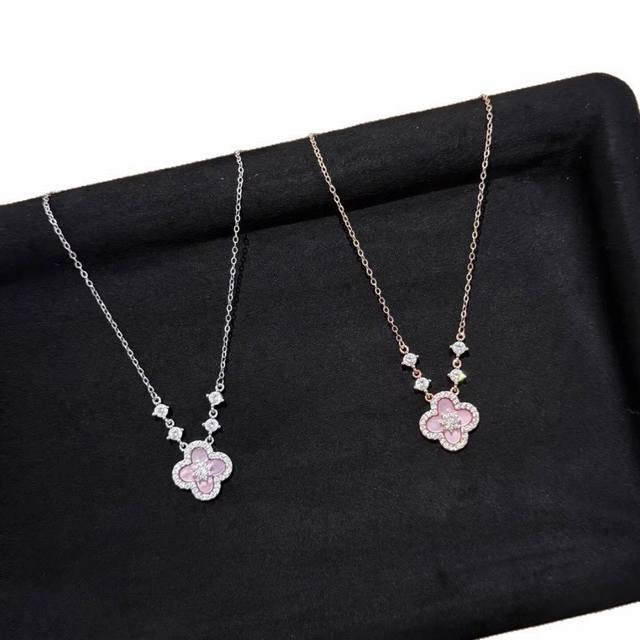 Dreamy Sweet Cherry Blossom Vintage Cherry Blossom Pink Mother-of-Pearl Four-Leaf Clover Necklace for Women, Light Luxury Clavicle Chain P