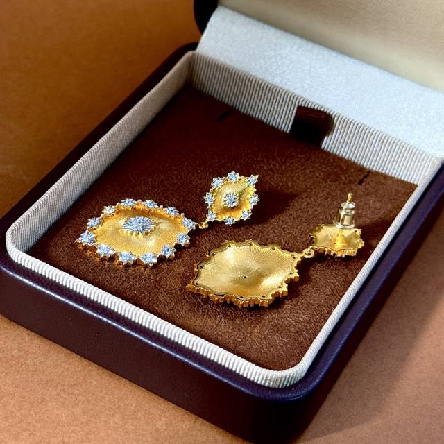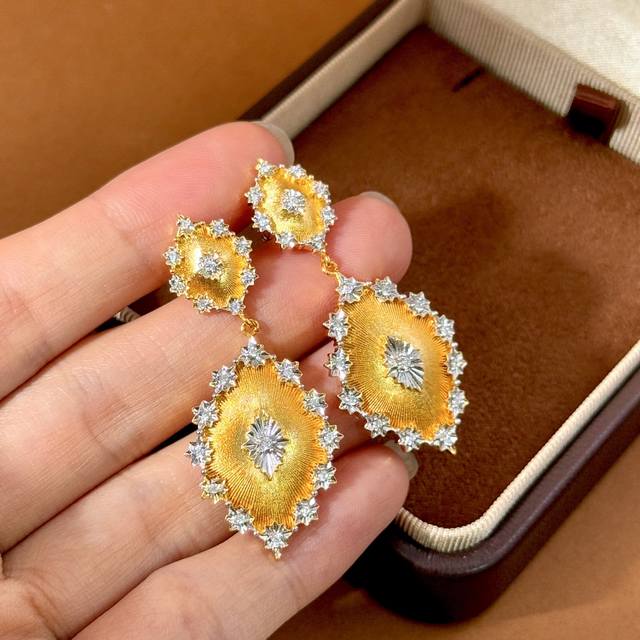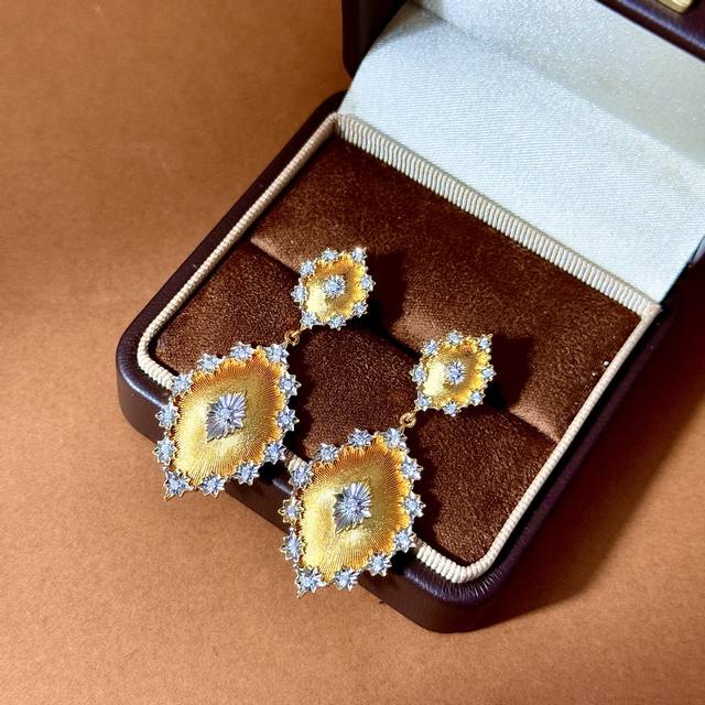 Italian Romantic Buccellati Style Retro Brocade Texture Earrings, Large and Small Double-Arched Diamond Shape, Gold Brushed White Gold with Diamond Carving, Small Flowers Surrounding, Gold and Silver Color Blocking, Brass Material, 18K Gold Plated. Dimensions: Total Length approx. 4.7cm, Top Width approx. 1.2cm, Bottom Width approx. 2.0cm.