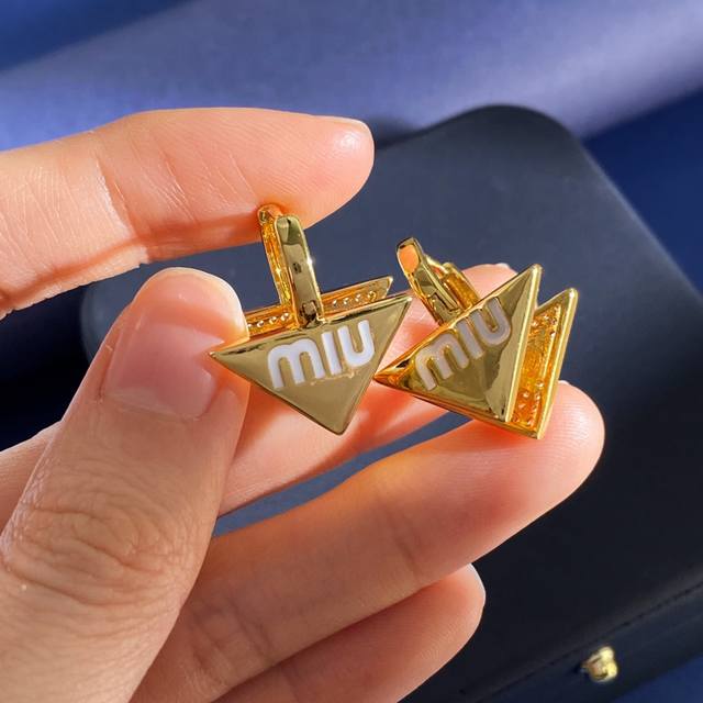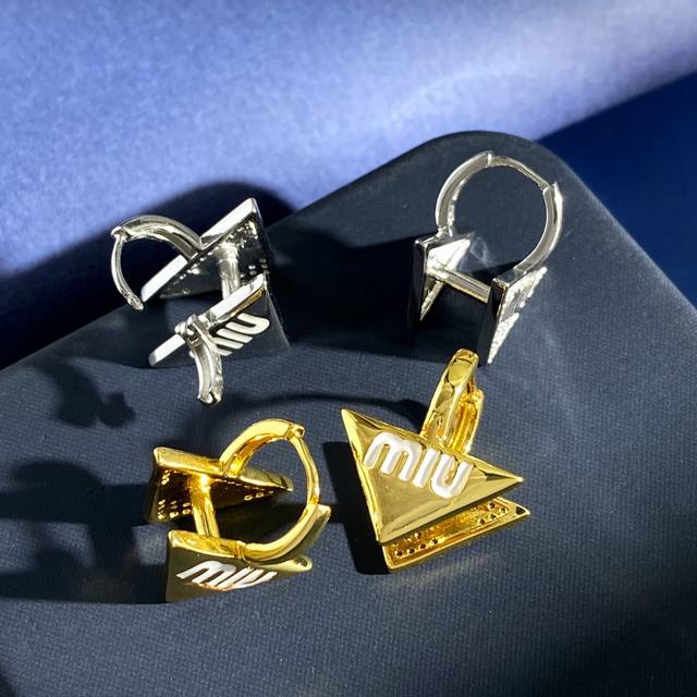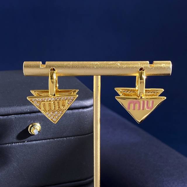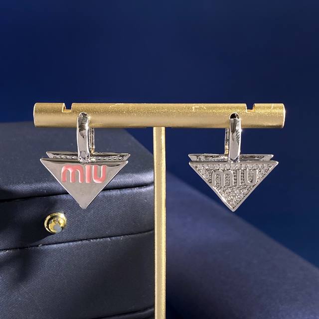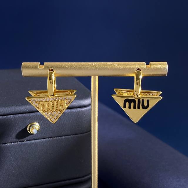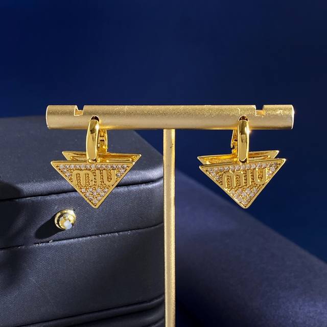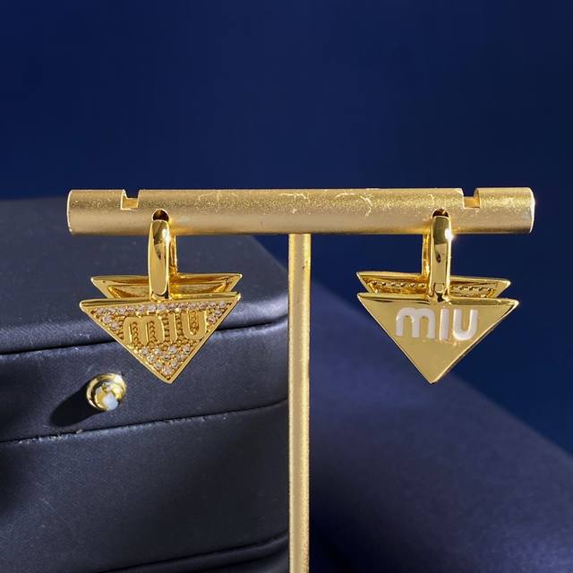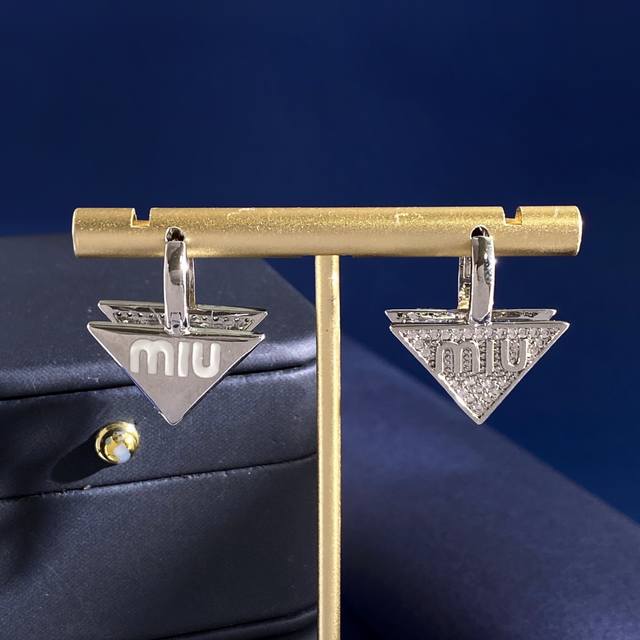 Miumiu high-end fashion and unique double-sided design, one side full of diamonds, the other smooth. Miu letter drip earrings, brass material, 5 pieces, weight approximately 8.9g. Total height approximately 2.2cm, triangle approximately 2.1cm * 1.1cm * 0.2cm.