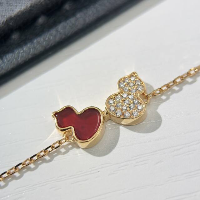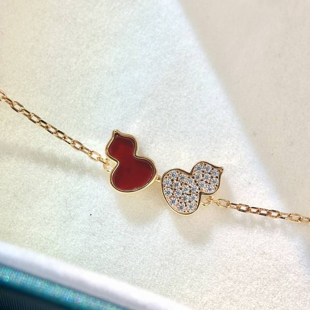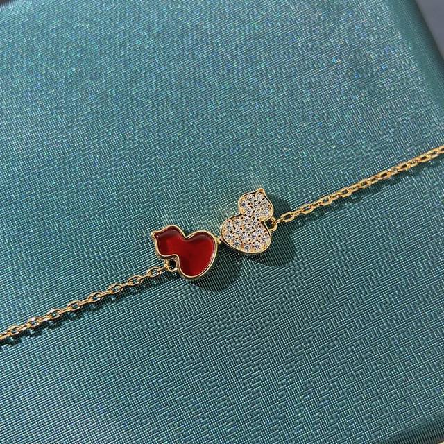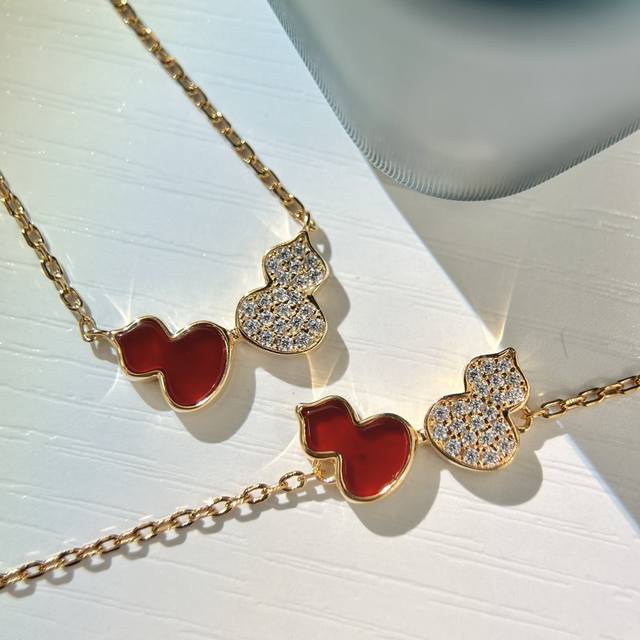 A2341 Double Wulu Latest Red Agate Mandarin Duck Gourd Set. Intertwined, bringing double happiness, amplified excitement, and continuous good fortune. The double-layered curves outline captivating charm, with two gourds, one large and one small, nestled together, just as our life trajectories intertwine with those of our loved ones, never separated. The gourd design is exquisite, with two smooth, full gourds intersecting on a single plane, creating visual depth and a unique look. Made of 925 sterling silver plated with thick gold, inlaid with eight-heart, eight-arrow high-carbon diamonds, the pav