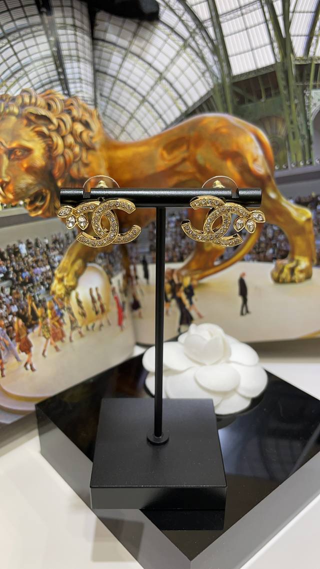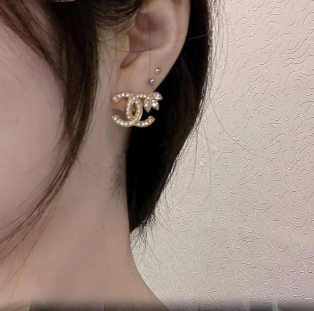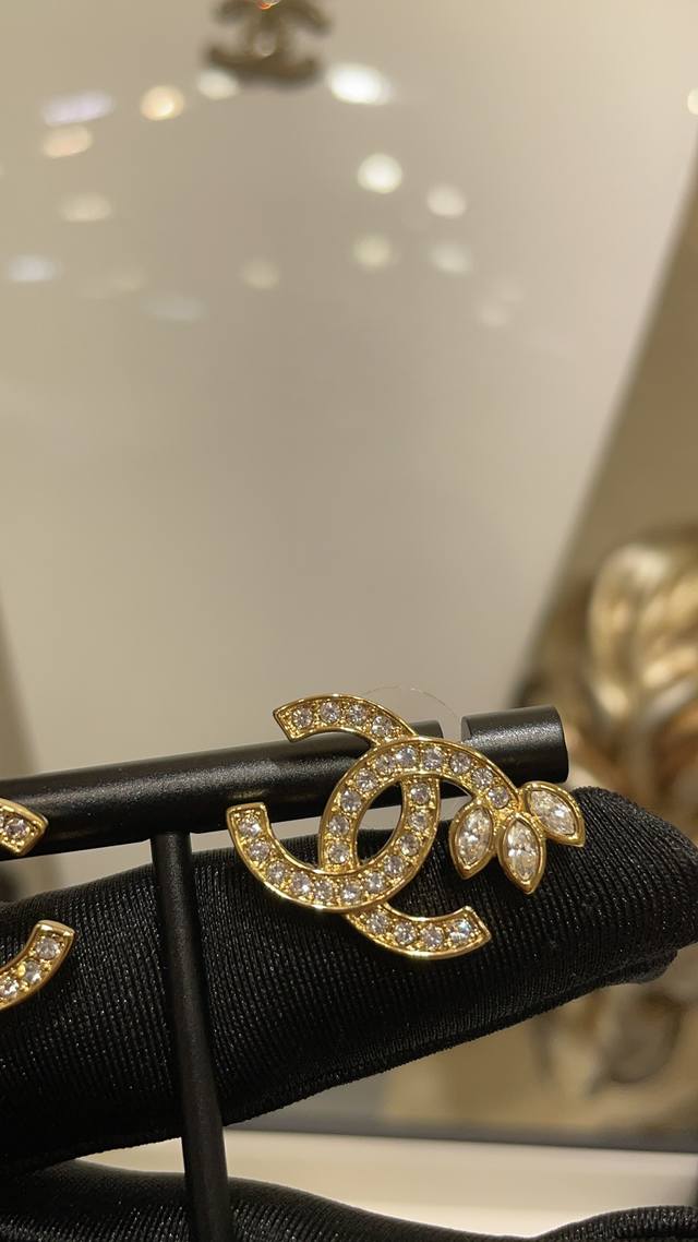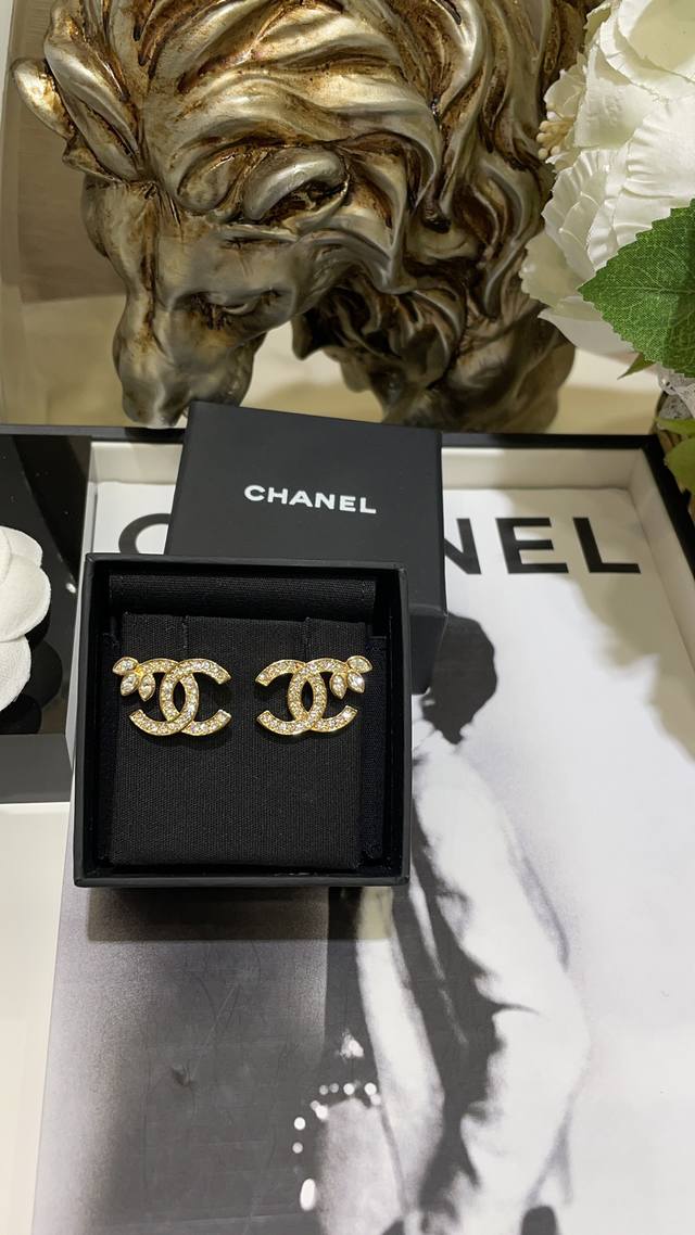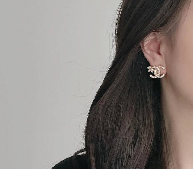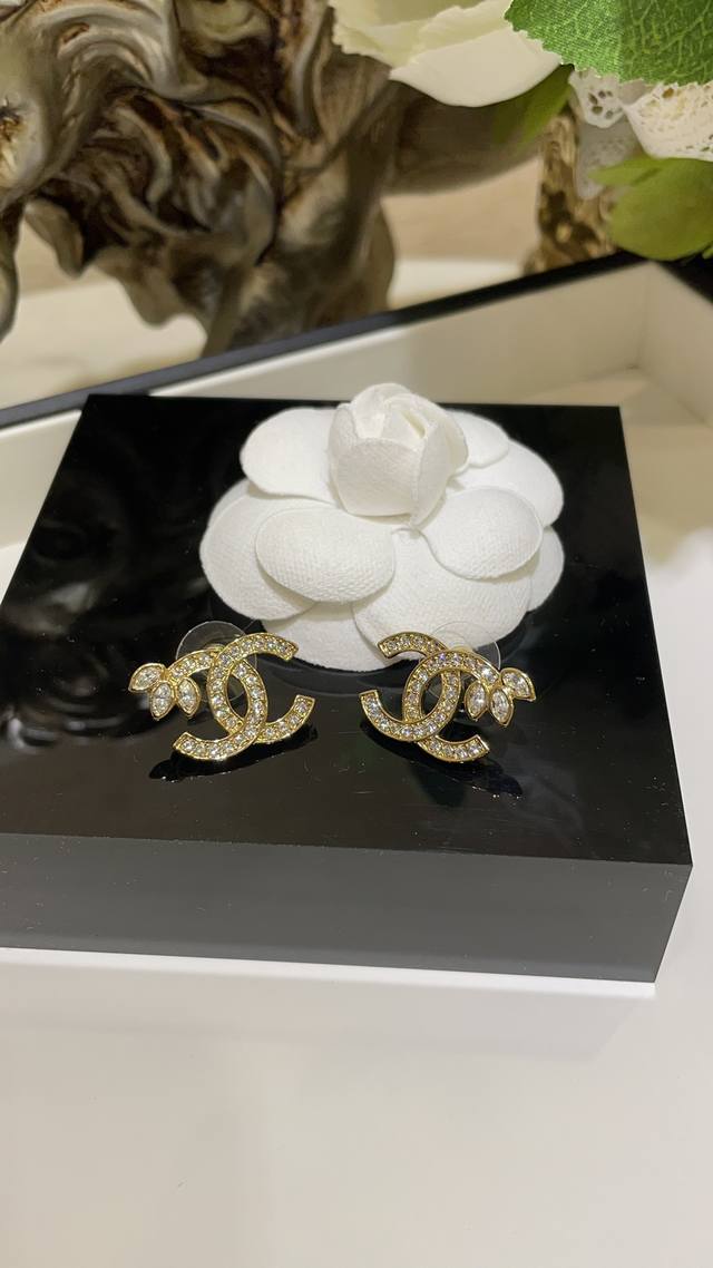 22K new full diamond wheat ear double C gold stud earrings