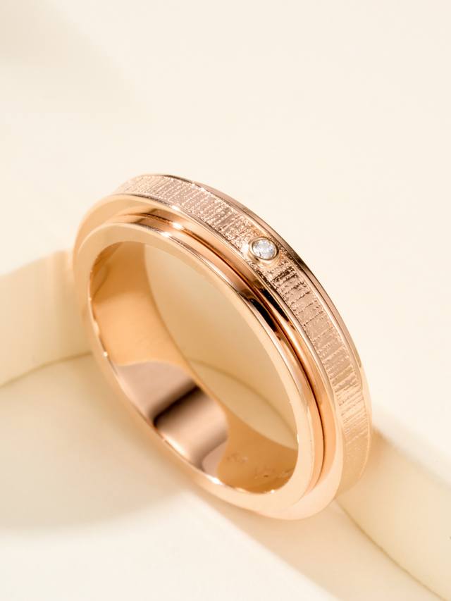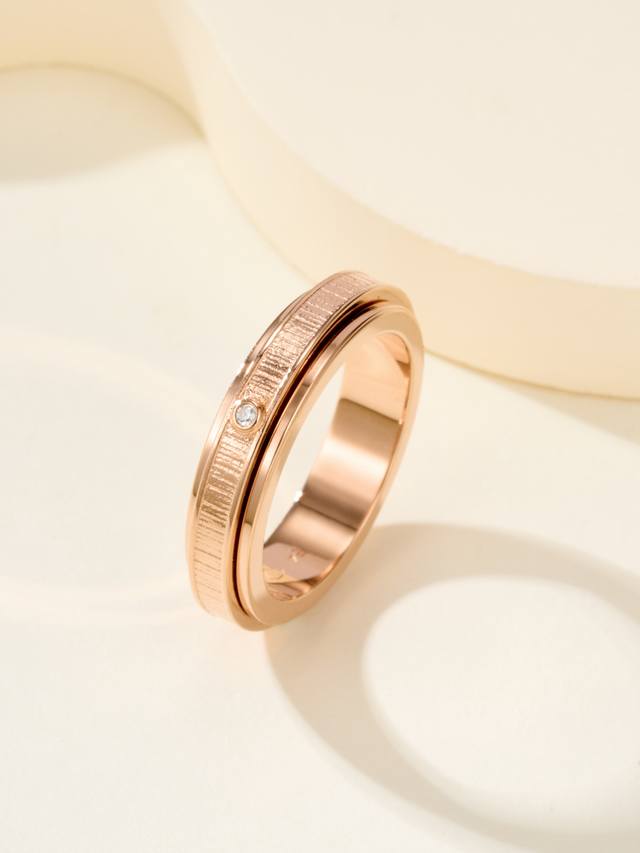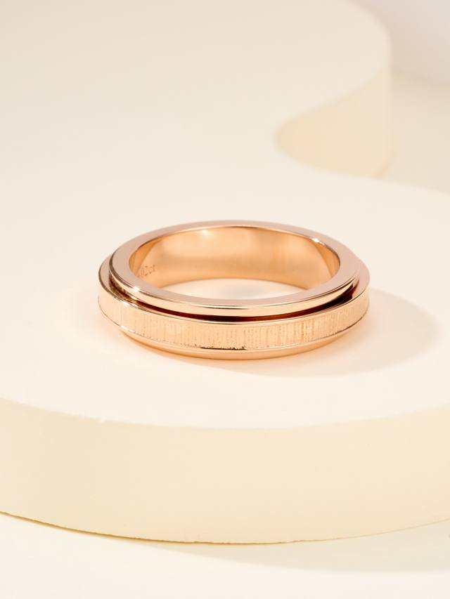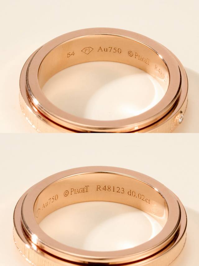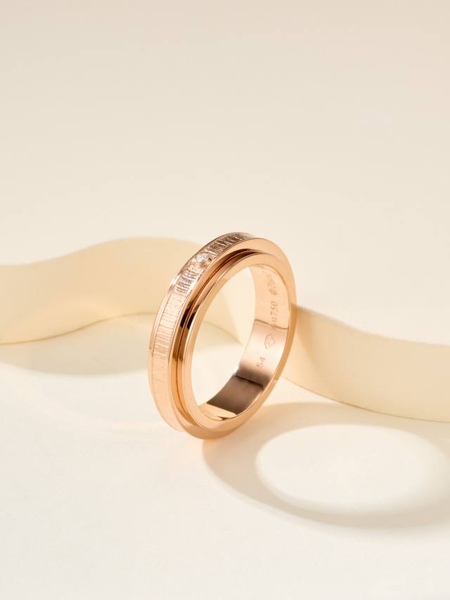 Ossession Lucky Turn series "Palace Totem" decorative ring, ring size 56789, rose gold. Set with one Ossession-style brilliant-cut diamond. The center ring of Piaget's Lucky Turn ring is movable, symbolizing auspicious fortune and "making money," perfect for those who love money. The palace-style pattern is creative and sparkling. And there's no worry about scratches after wearing it for a long time. The new Lucky Turn ring is made from a Z-batch pattern, engraved using a CNC engraving machine. Each ring component is precisely crafted, eliminating any uneven edges and preventing any lag. Z-batch is also CNC-made. Products produced by casting on the market tend to lag when rotating and feel inferior. Because of the CNC process, the diamonds must be hand-set. Although this is a jewelry ring, it truly achieves the Z-batch feel.