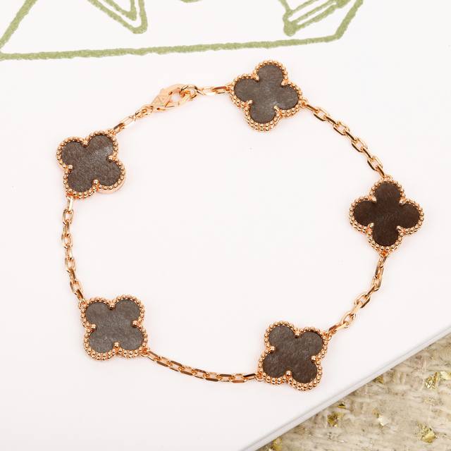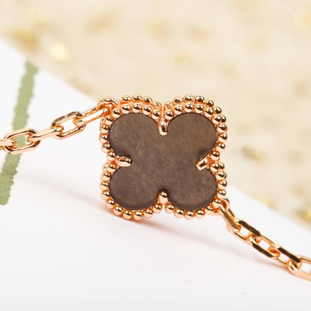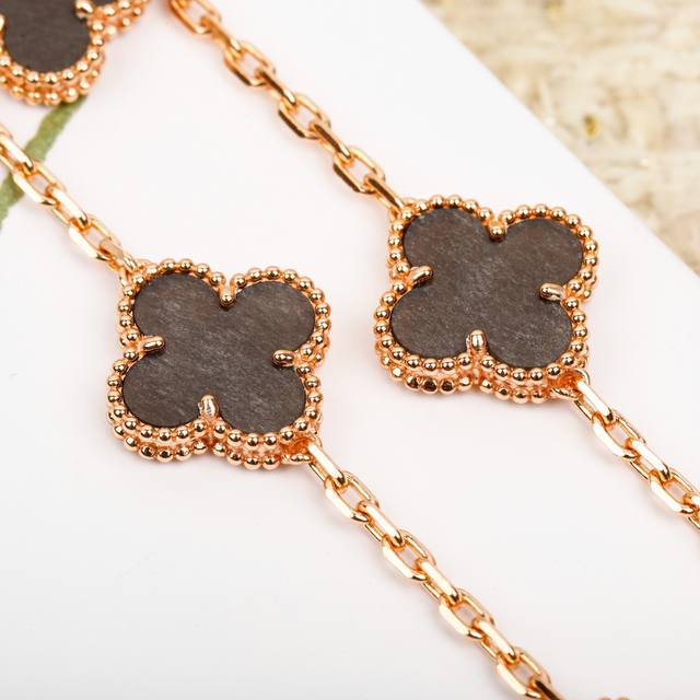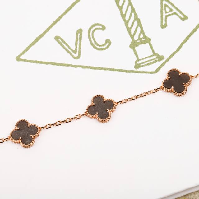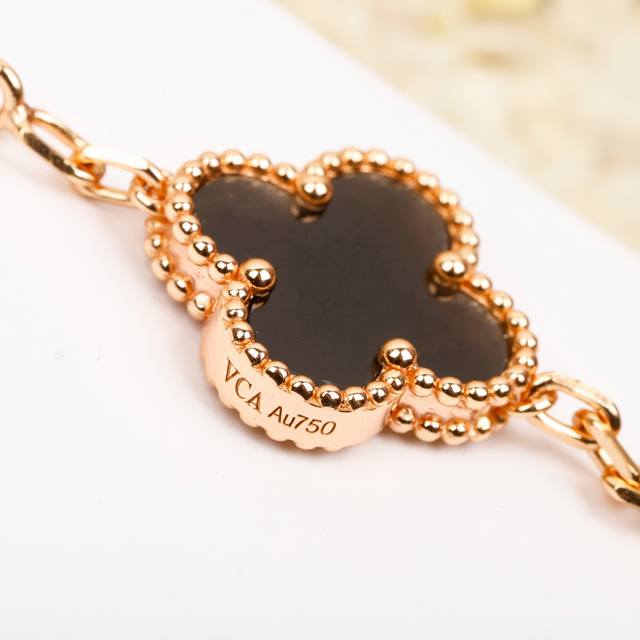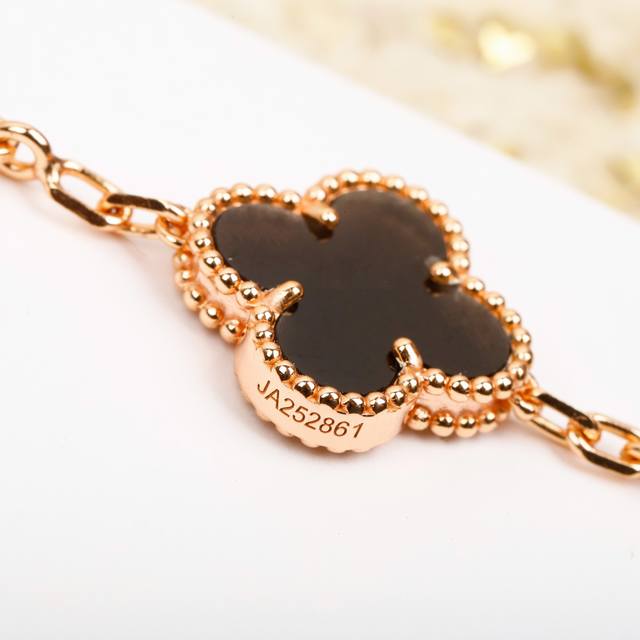 Our five-flower bracelet, batch Z, is a genuine gold and diamond jewelry item. Custom-made genuine gold and diamond versions are available; please inquire for pricing. Our finely crafted sterling silver with thick gold plating is finally finished! There are countless versions on the market, but after seeing batch Z, you'll understand that only our product can meet the discerning eyes of discerning customers. Our four-leaf clover design has been under development for more than a year or two; it takes nearly two years to finalize each version. Therefore, please cherish this one. Batch Z features a genuine diamond-shaped lobster clasp. This clasp has three layers: First, there are two protruding diamond shapes on the front and back, and the Vca letters above the diamonds are in a double-stroke hollow font. (See enlarged image.) Furthermore, on both sides of the four-leaf clover closest to the diamond-encrusted lobster clasp of the Z-batch bracelet, one side is engraved with the serial number of each fully rhinestone-encrusted four-leaf clover, and the other side is engraved with the brand's abbreviation and the composition of the Z-batch. The engraving is not laser-engraved, but meticulously carved, resulting in a deep and three-dimensional visual effect. Thirdly, the next clasp connecting the loop at the very end of the Z-batch bracelet is directly welded, not simply snapped on. This means we have to weld a circle and an oval together. For production and development, to achieve this detail for the Z-batch, we have to spend an extra 5 minutes completing this welding process for each finely crafted bracelet. Fourthly, the four-leaf clover design uses two thick circles as interfaces to connect the patterned square chain. The key point is that at the connection between the circle and the chain, Z-grade uses a circular