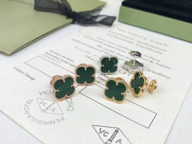 Stud Earrings, UFO Style Earring Backs, P30Vca Van Cleef & Arpels 1.5 Medium Four-Leaf Clover Stud Earrings - Classic and Timeless! Buling Buling~ Featuring 925 Sterling Silver Needles, Hypoallergenic Rose Gold, Yellow Gold, and White Gold. The full floral design is complemented by black onyx, white mother-of-pearl, red agate, and malachite. Elegant and a top choice. Original UFO Style Earring Backs.