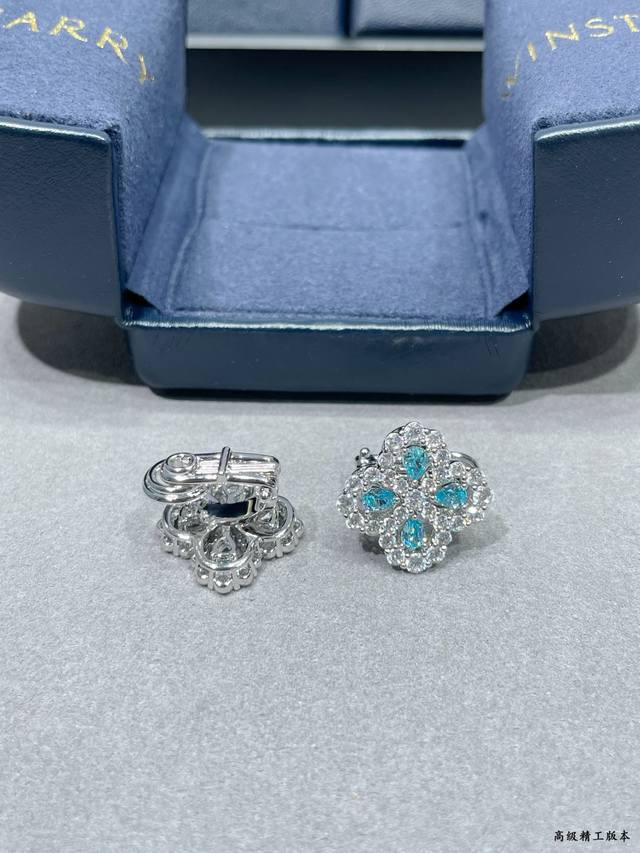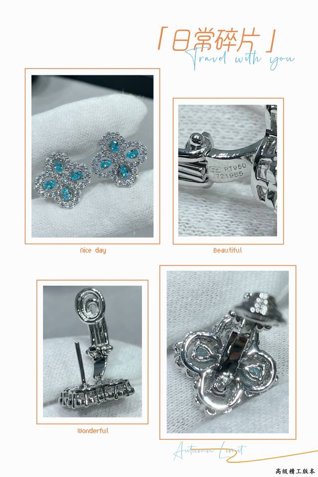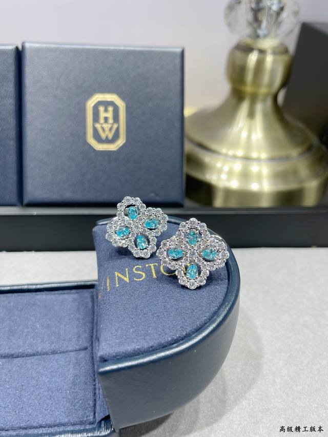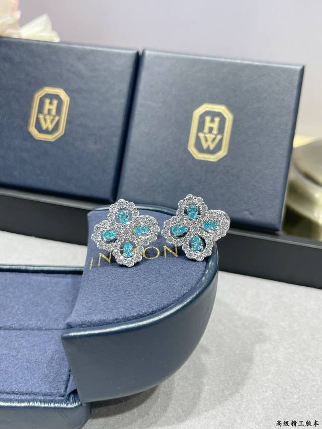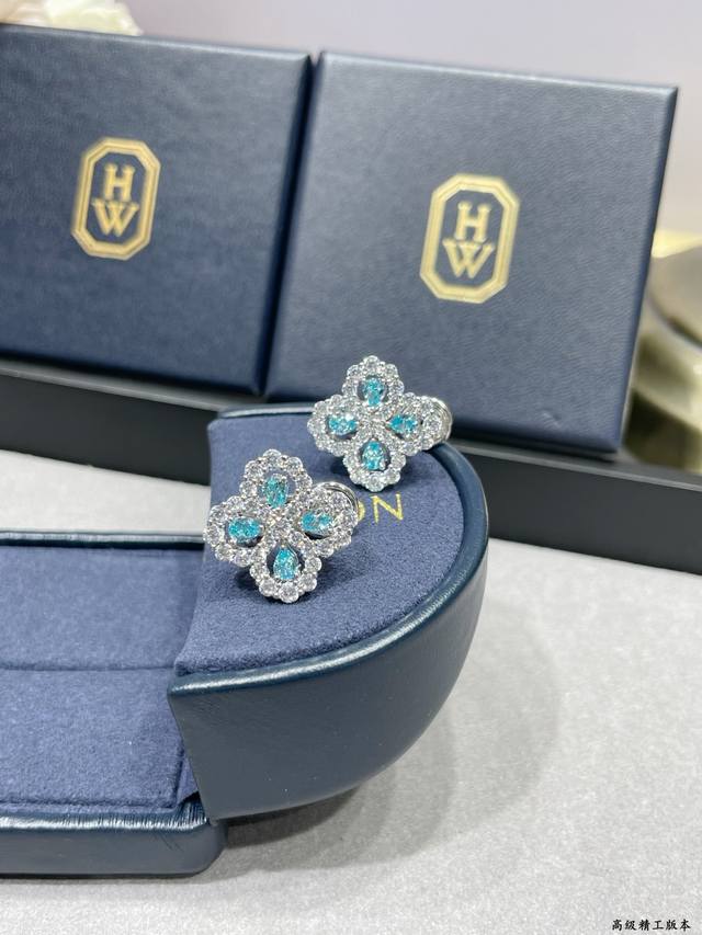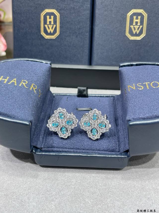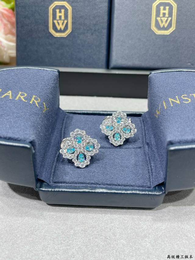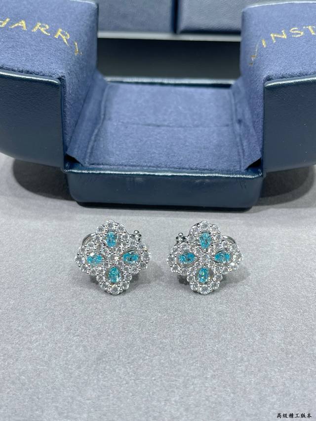 V Gold Blue Diamond Harry Winston Full Diamond Clover Earrings# Diamond Links Series Diamond Earrings, her every frown and smile, elegant and charming yet rational and tough, complements the brand's iconic emerald cut diamonds, complementing each other.