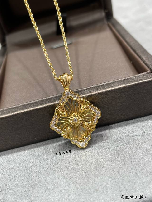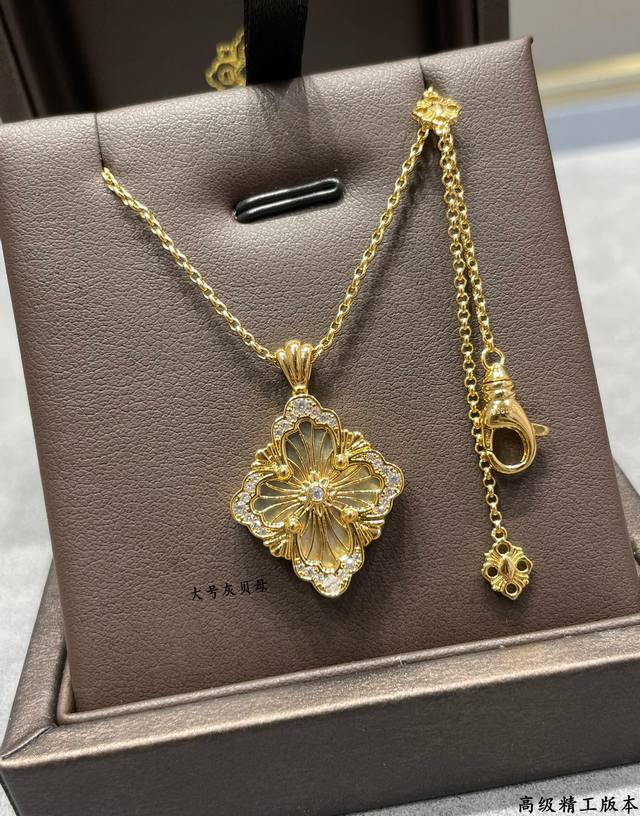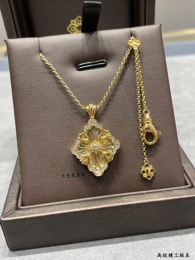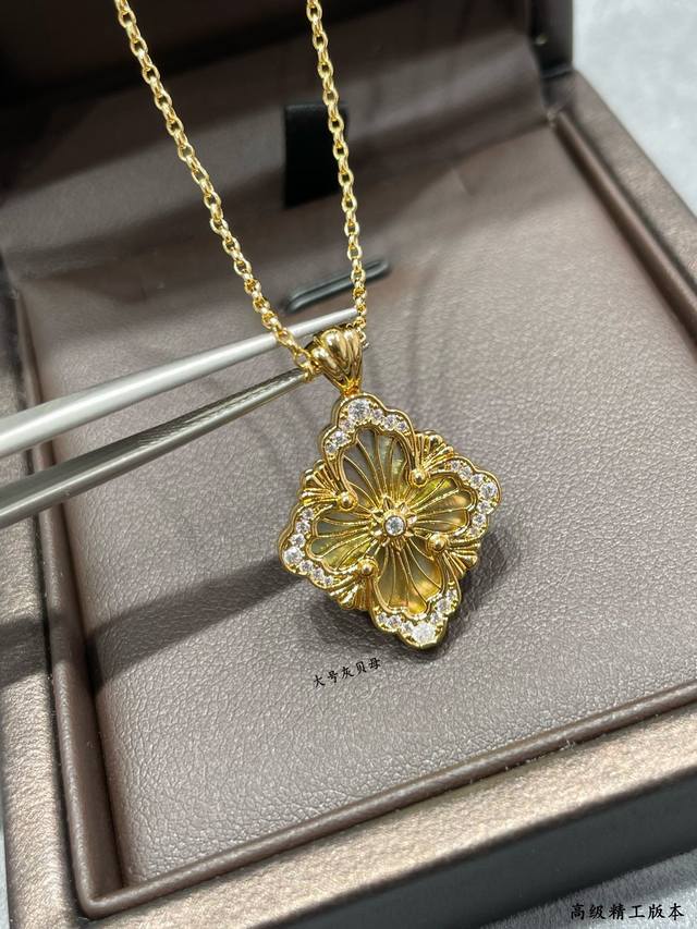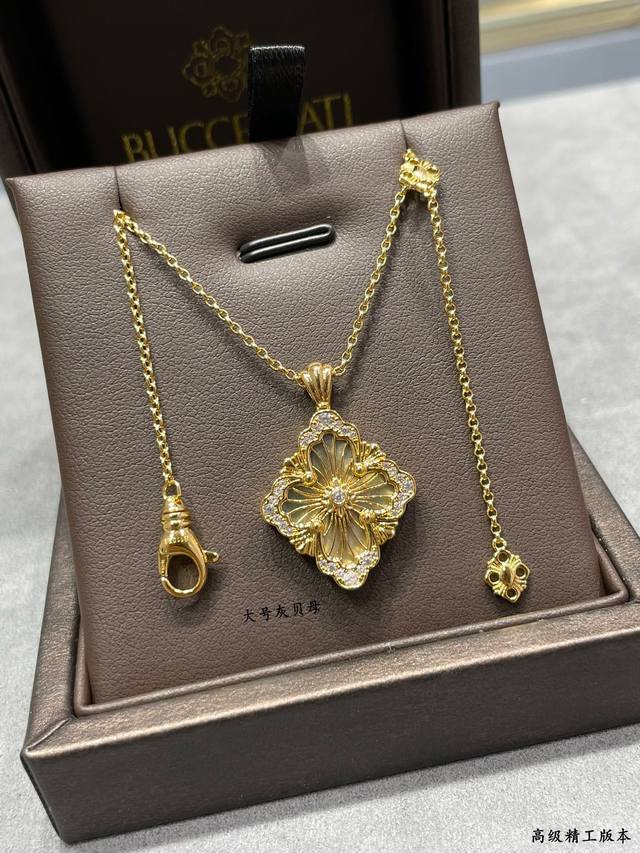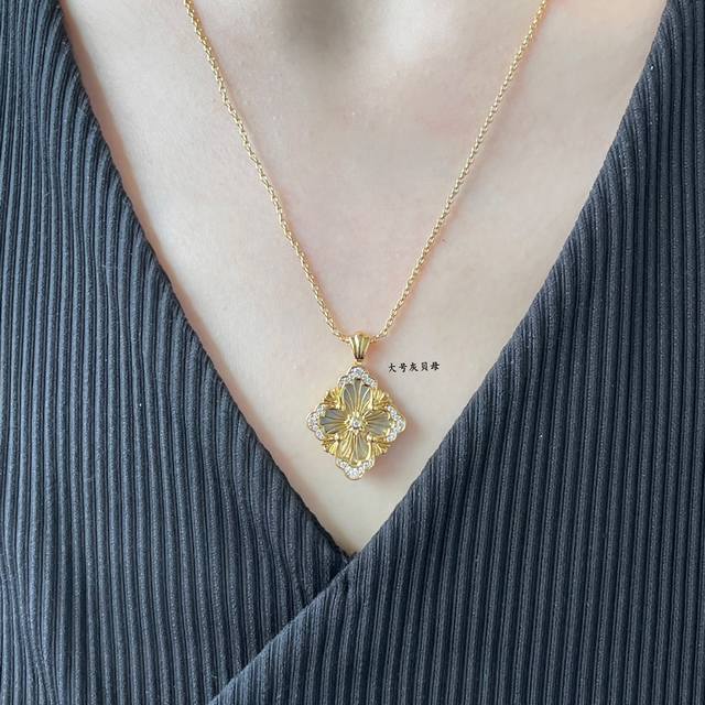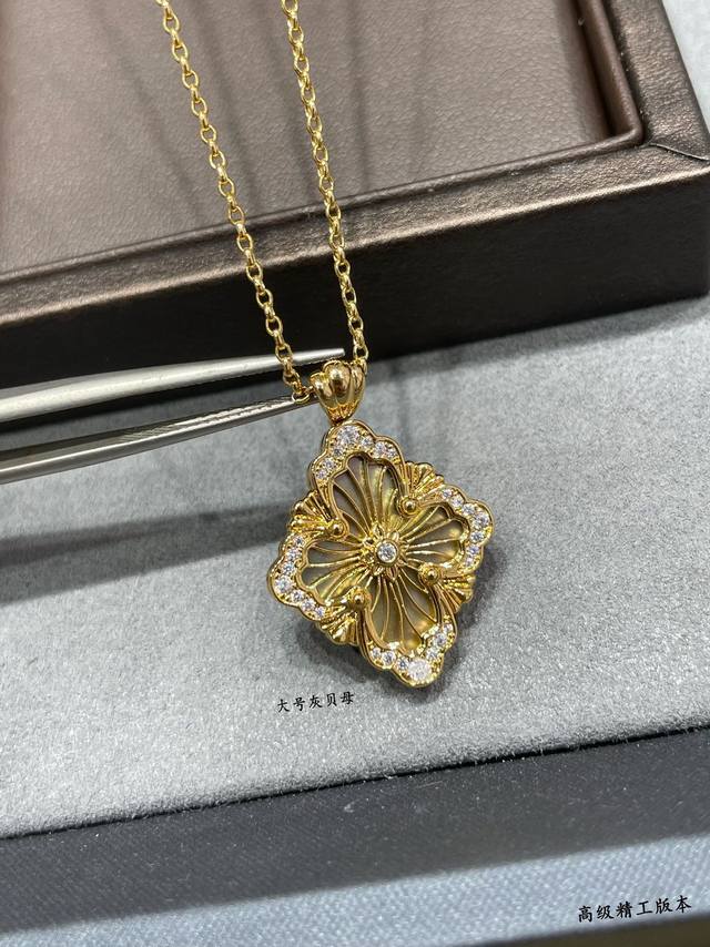 V Gold Buccellati Large Opera Series Gray Mother-of-Pearl Necklace, Retro Palace Style Four-Leaf Clover, Four-Petal Shell Double-Sided Necklace, Very Italian Style, The Whole Work Is Exquisite and Gorgeous While Adding an Artistic Feel, Using Rigato Parallel Grain Carving Technique to Create a Unique Satin Craft, Geometric Rhombus Carving Inlaid with Sparkling Diamonds, It Exudes a High-End Elegance from the Inside Out