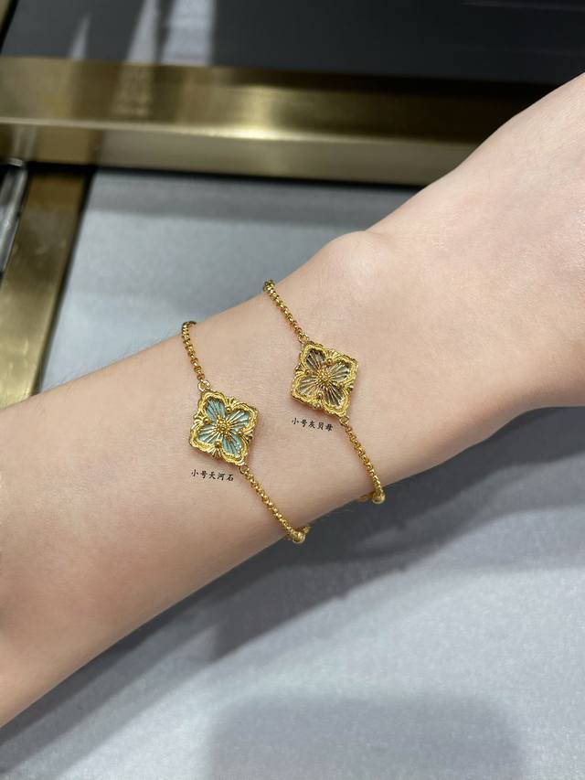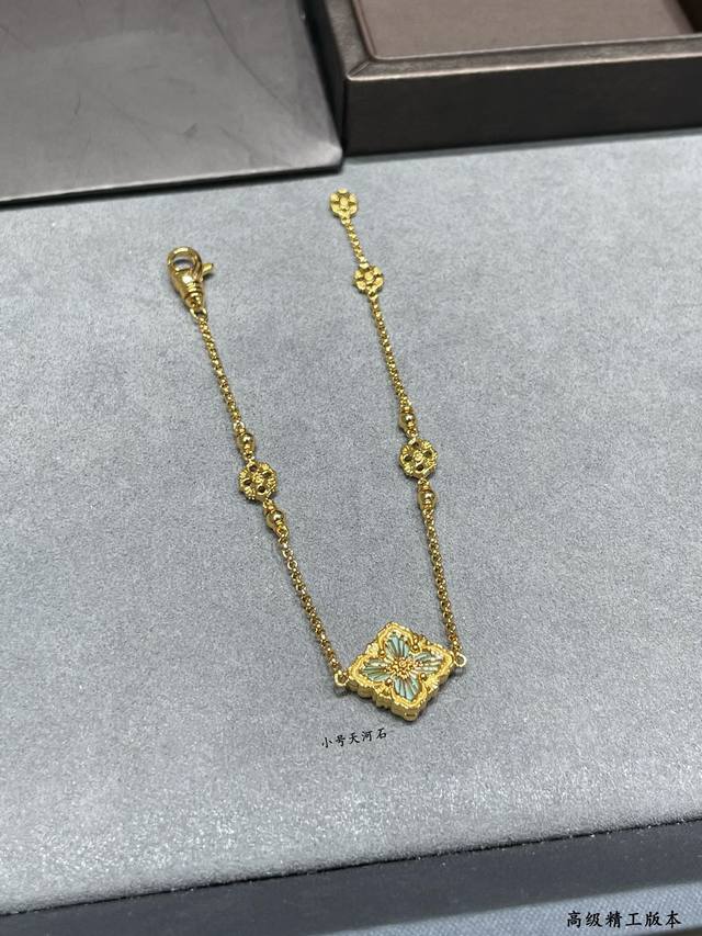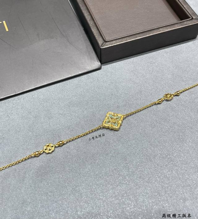 V Gold Buccellati Small Opera House Series Amazonite Bracelet, Retro Palace Style Four-Leaf Clover, Four-Petal Shell Double-Sided, Very Italian Style, The Whole Piece Is Exquisite and Gorgeous While Adding an Artistic Feel, Using Rigato Parallel Grain Carving Technique to Create a Unique Satin Craft, Geometric Rhombus Carving Inlaid with Sparkling Diamonds, It Exudes a High-End Elegance from the Inside Out