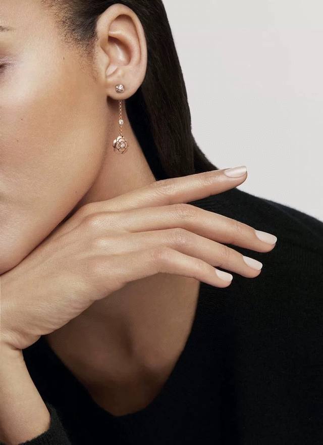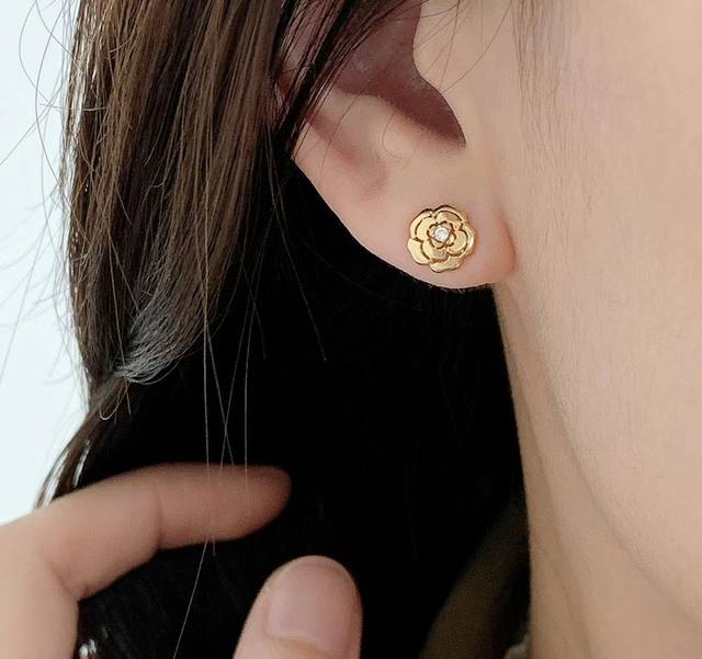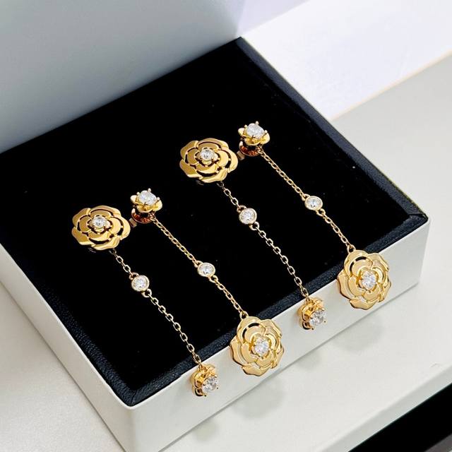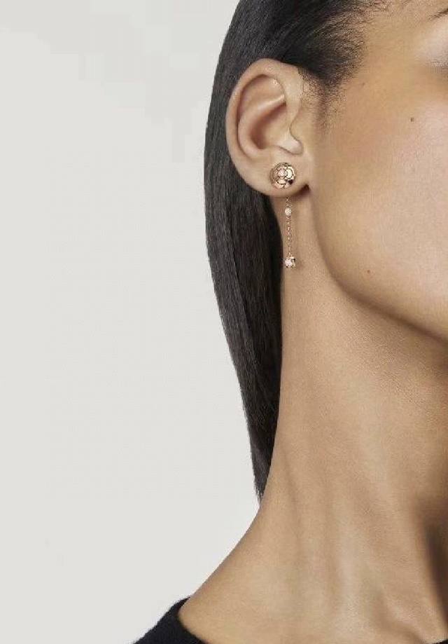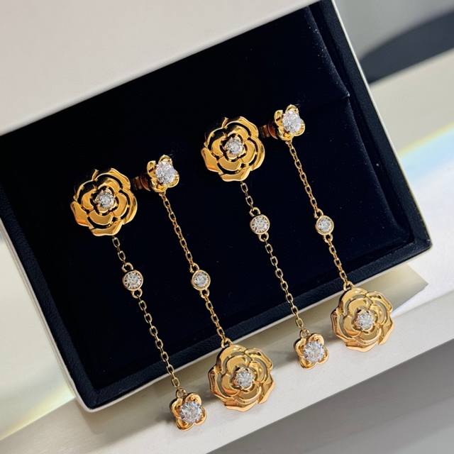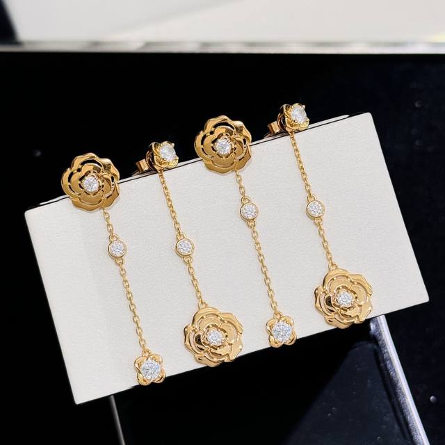 V Gold High Edition Chanel-style Camelia series hollow camellia asymmetrical earrings, inlaid with high-end imported crystal diamonds, highly recognizable iconic classic pattern, with superb texture and elegant temperament, the three-dimensional petals are very delicate, the petals have smooth and graceful curved contours, and the petals are staggered and layered around a sparkling crystal diamond in the center, which is very smart. Platinum and rose gold two-tone vacuum electroplating thick gold, detachable earrings with multiple wearing methods