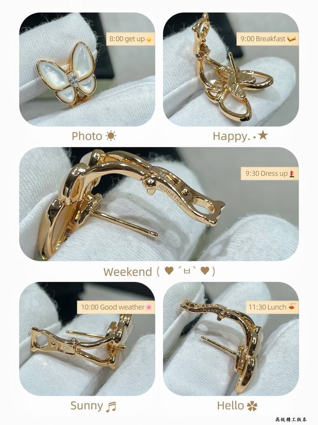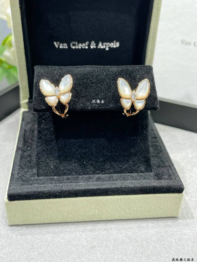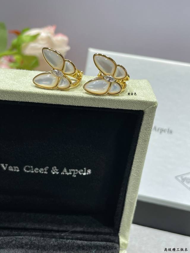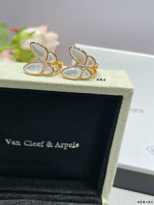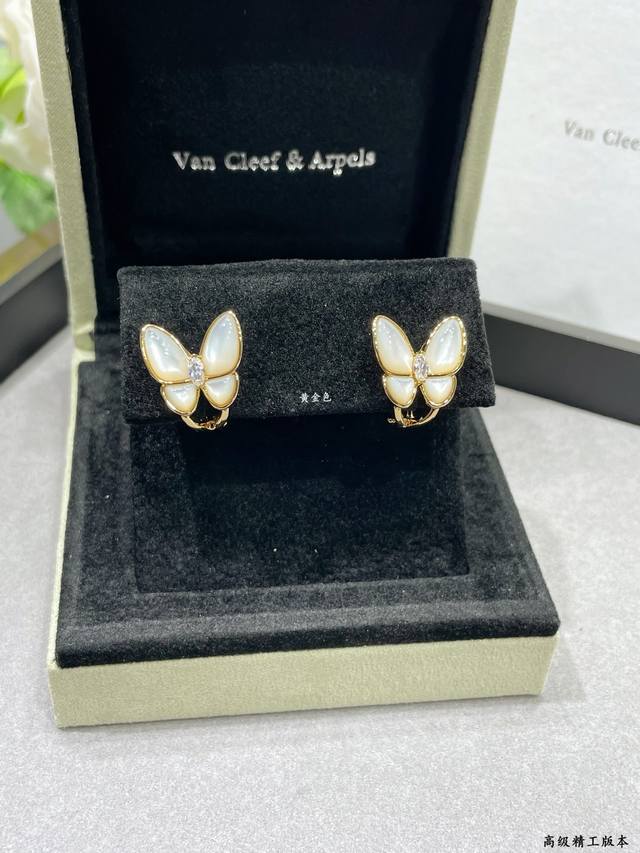 V gold material Vca high-grade white mother-of-pearl butterfly earrings, this pair of upper earrings is very elegant and durable. The high-grade mother-of-pearl used is carefully selected. It looks smooth, full and round, with a sense of thickness and layering. The entire side looks very curved and smart. There are not many good ones and it is difficult to make them. If you like it, place an order first.