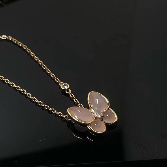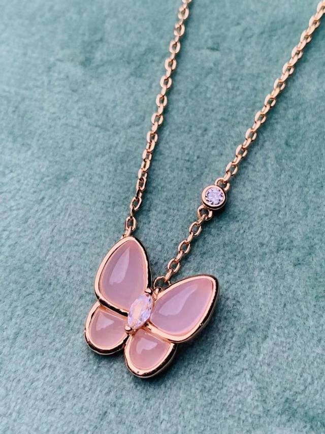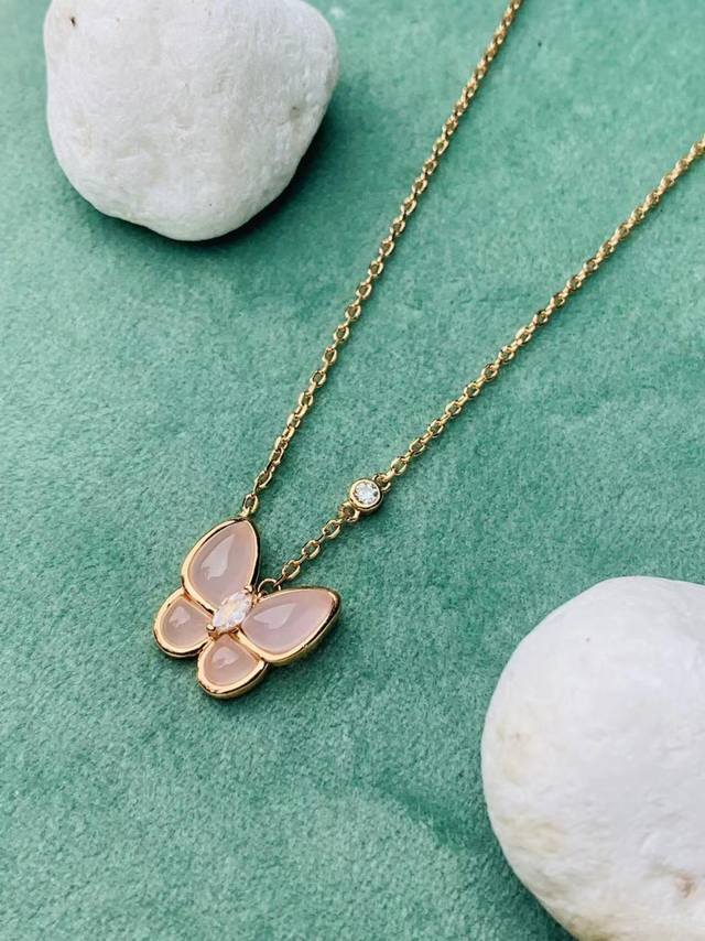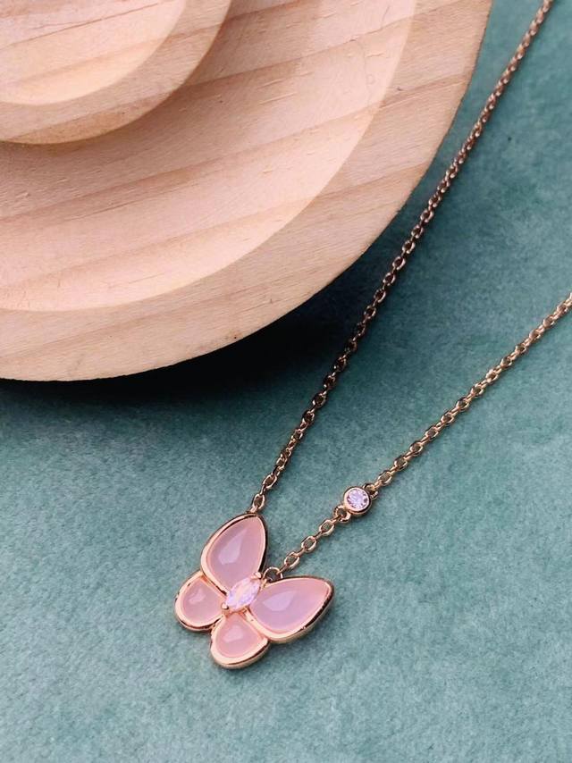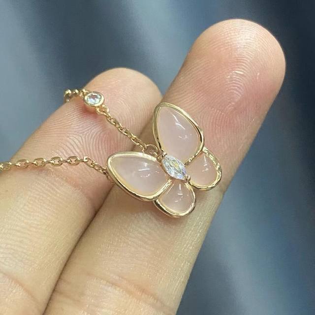 / V gold material Vca natural pink chalcedony butterfly necklace