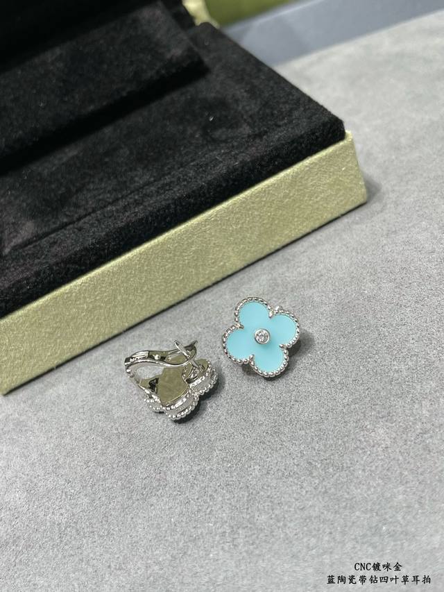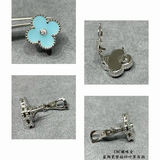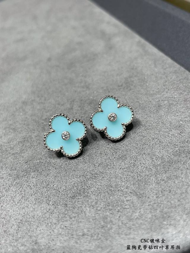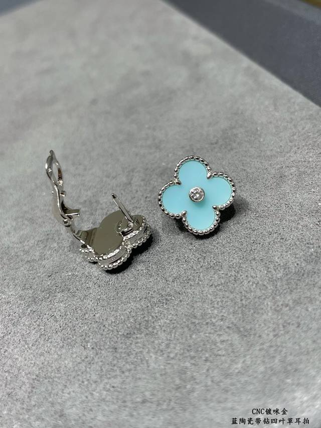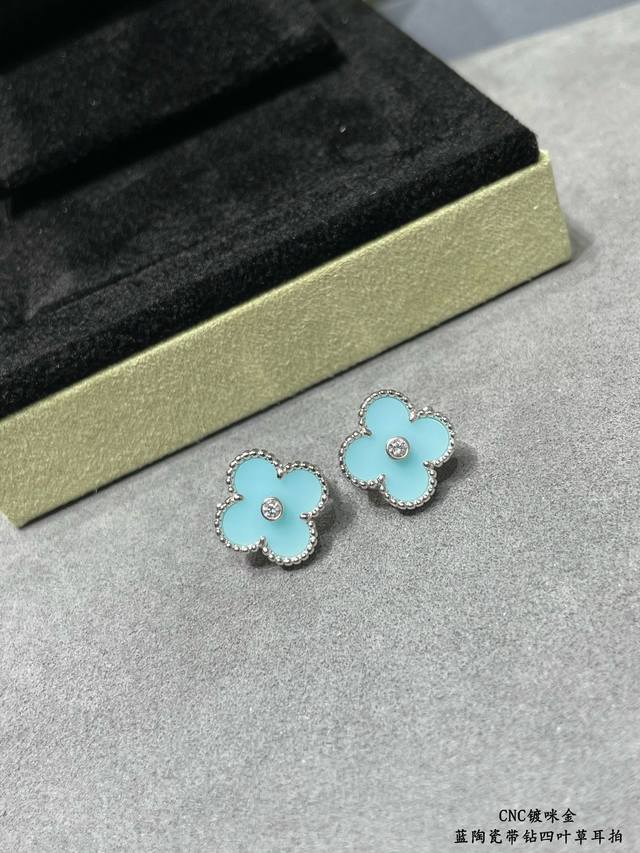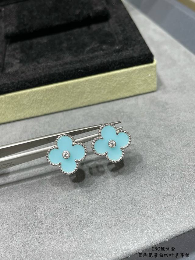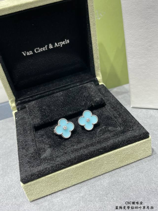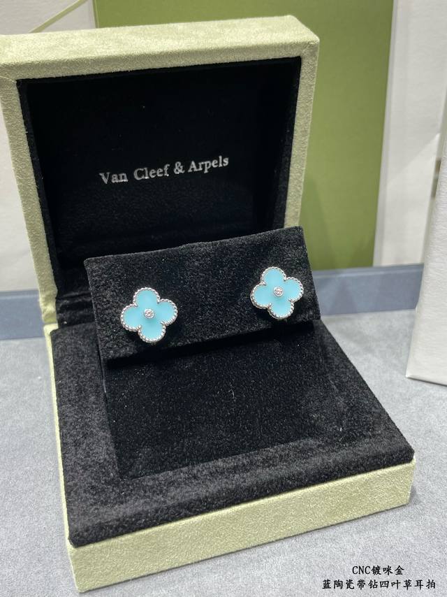 V gold plated with gold. Original design, high-quality CNC, Vca blue ceramic rhinestone four-leaf clover earrings. Super accurate shape, perfect flower pattern, excellent bottom finishing, authentic details. Many versions on the market are incorrect! Excellent luster. Definitely keeping one for myself. (