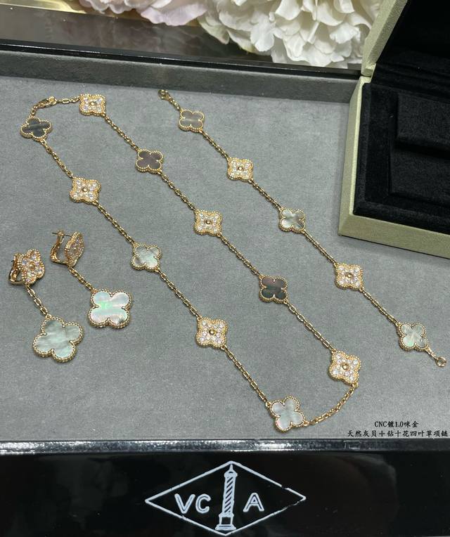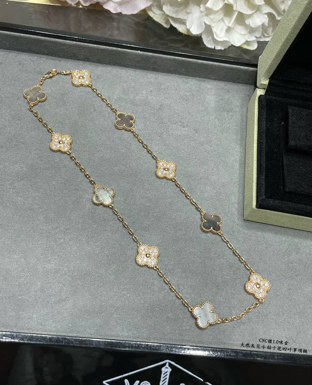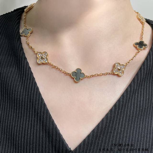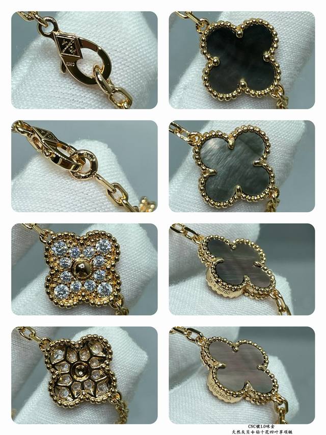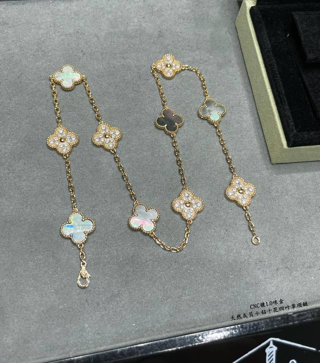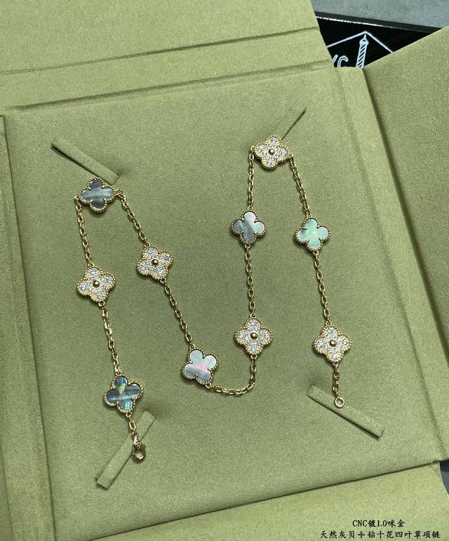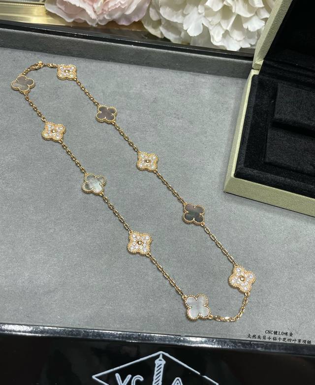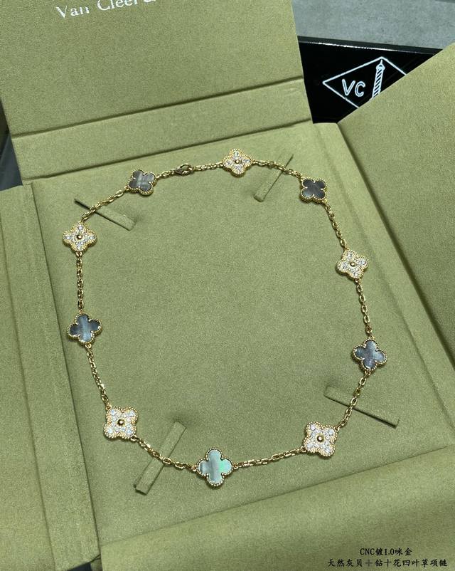 V Gold Plated with Mitsubishi Gold Vca Natural Grey Mother-of-Pearl Diamond Ten-Flower Four-Leaf Clover Necklace. Cleef & Arpels' four-leaf clover series features a dynamic design with smooth lines, making it easy to wear. It showcases endless styling possibilities, bringing a rich and diverse style to every woman's life.