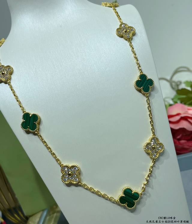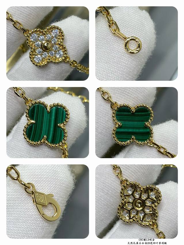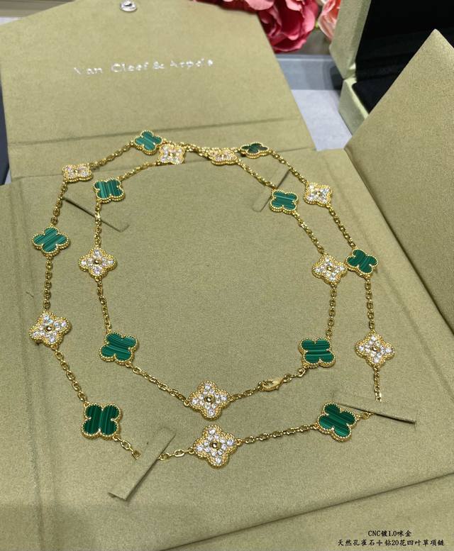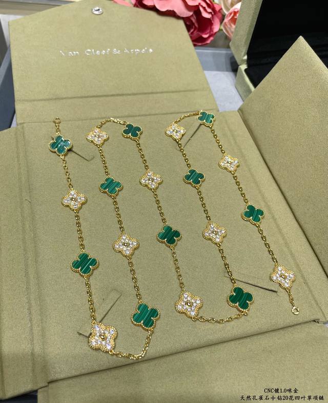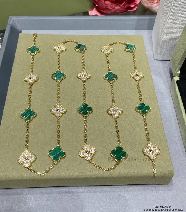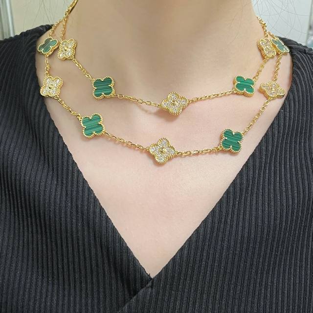 V gold, Vca natural malachite and diamond 20-flower four-leaf clover necklace. Cleef & Arpels' four-leaf clover series features a dynamic design with smooth lines, making it easy to wear. It showcases endless styling possibilities, bringing a rich and diverse style to every woman's life.