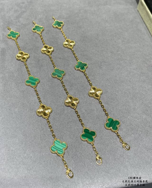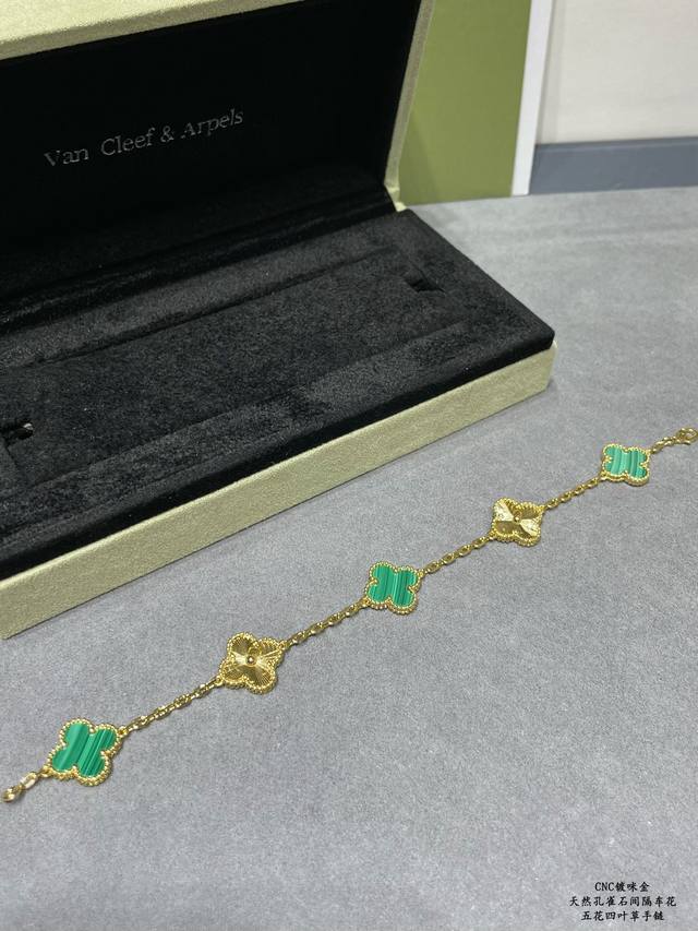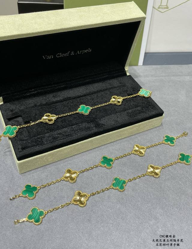 V gold, Vca natural malachite, spaced-out four-leaf clover bracelet. Cleef & Arpels' Els four-leaf clover series features a dynamic design with smooth lines, making it easy to wear. It showcases endless styling possibilities, bringing a rich and diverse style to every woman's life.