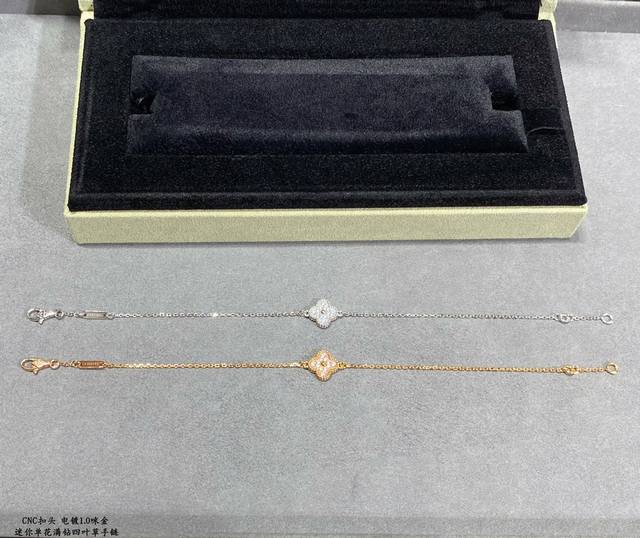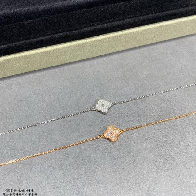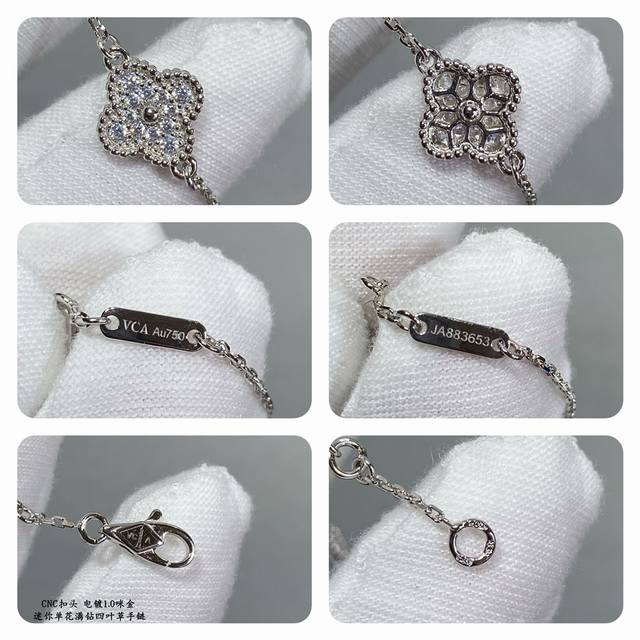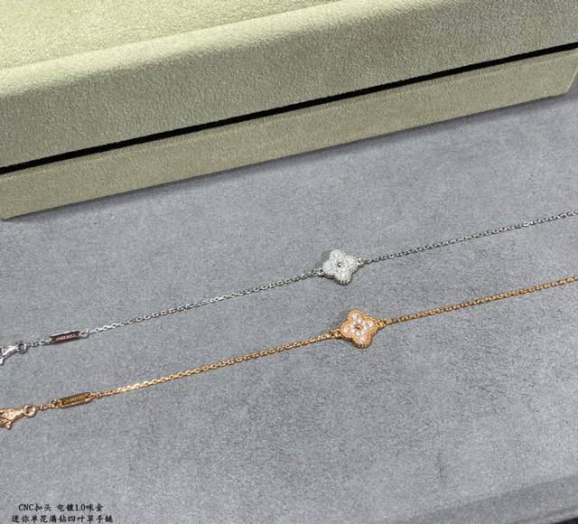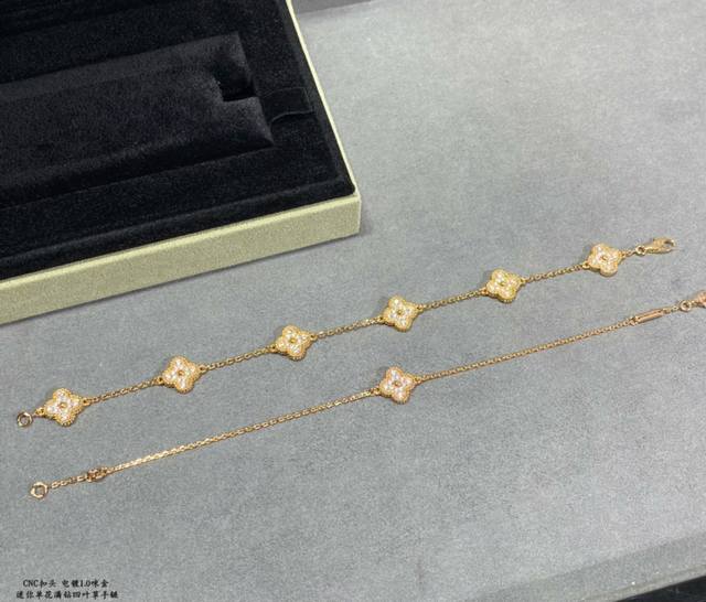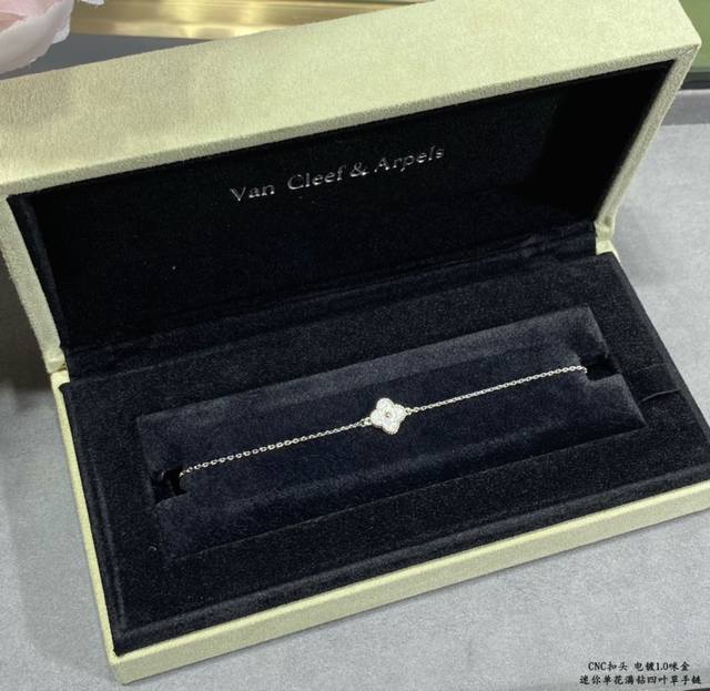 v gold-plated CNC clasp. Original clasp, 0.9mm VCA, full diamond mini single flower four-leaf clover bracelet. The shape is superb, with diamond-shaped holes on the back and the flower pattern at the bottom. Full closure and stamped! Authentic details, many copies on the market are incorrect! Excellent luster. Definitely a replica that's so authentic, I'm definitely keeping it! Inlaid with eight hearts and eight arrows high-carbon diamonds