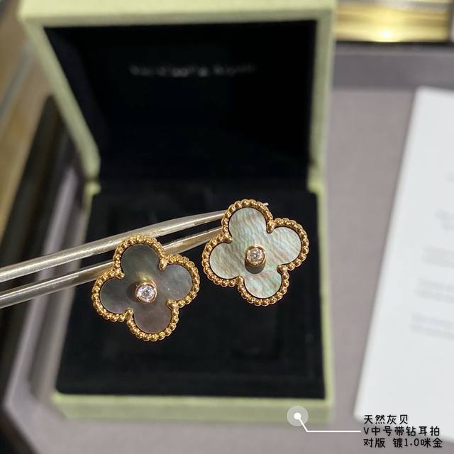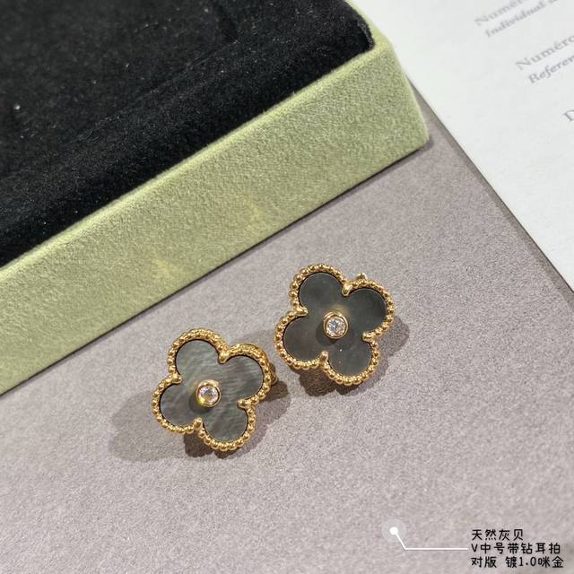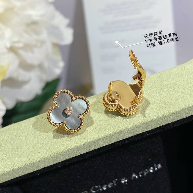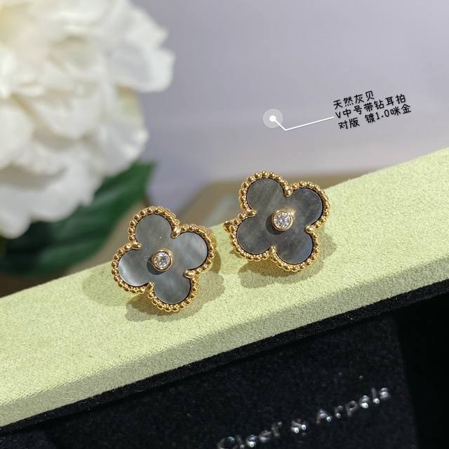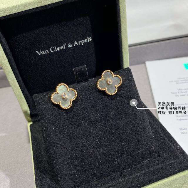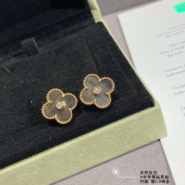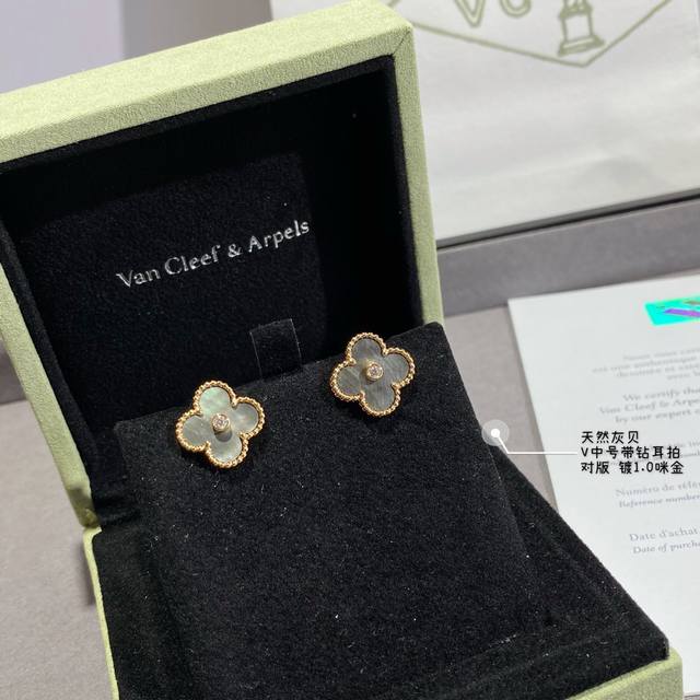 V gold-plated Vca four-leaf clover natural gray shell with diamond earrings, market premium version 1:1 version, high-end custom Vca Van Cleef & Arpels limited edition, V four-leaf clover, counter limited edition, perfect for travel, absolutely a must-have. The highest quality on the market.