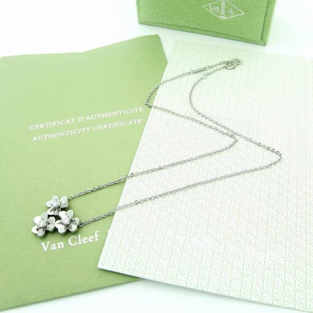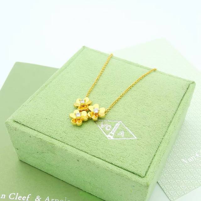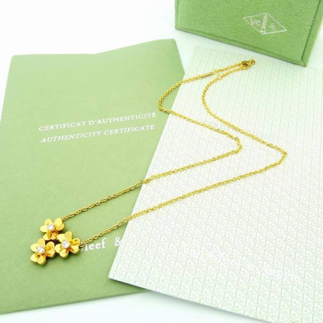 Van Cleef & Arpels Frivole collection evokes the graceful movement of flowers in the gentle breeze. Made of matte gold plated with 18K gold. Clover necklace