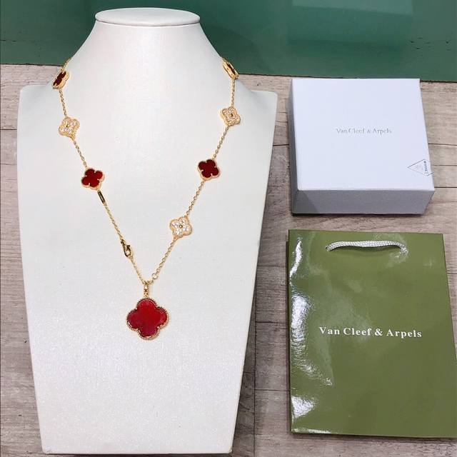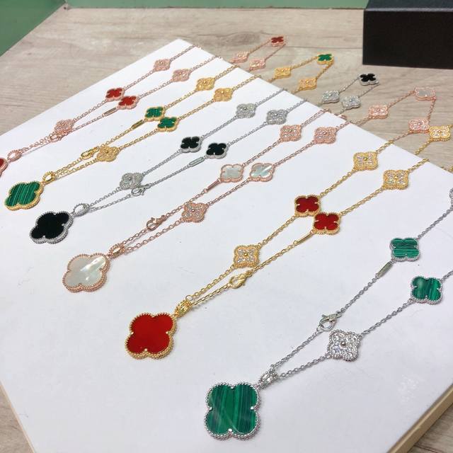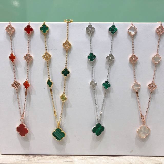 Van Cleef & Arpels short necklace with diamonds, featuring a ten-flower necklace and a large four-leaf clover pendant, unlocks a new style for the four-leaf clover. The novel and unique micro-pave technique makes each diamond-encrusted four-leaf clover pendant exceptionally textured and fashionable. (Batch