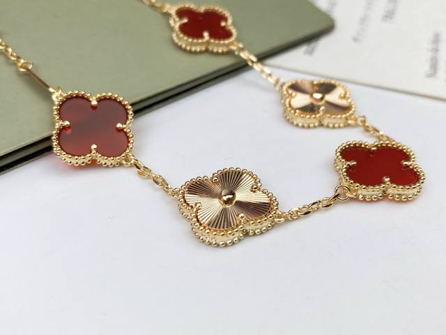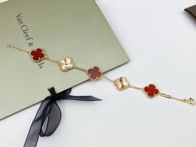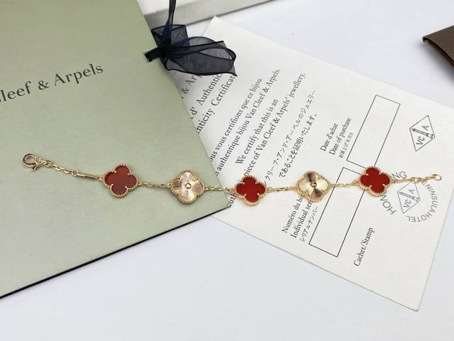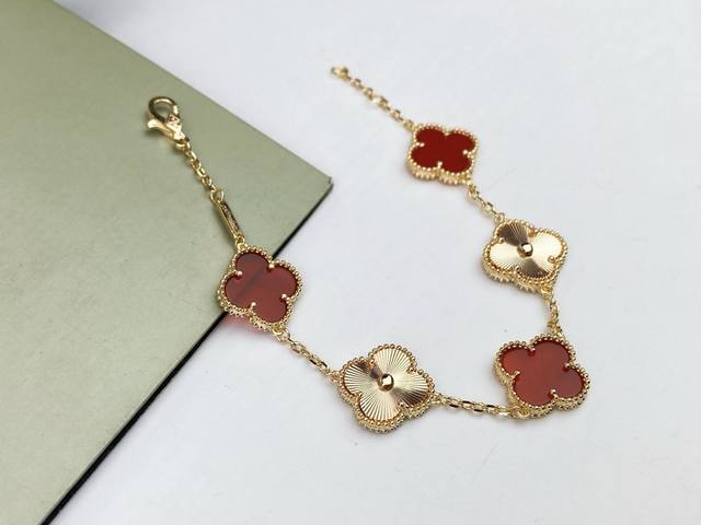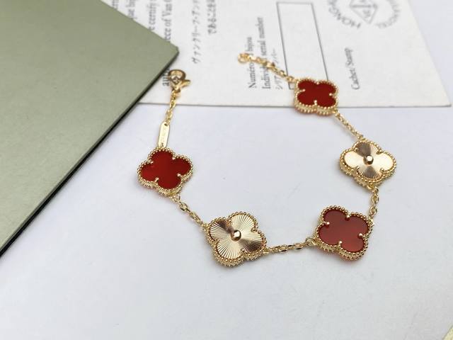Vca Van Cleef & Arpels' four-leaf clover and five-flower bracelet features a unique combination of laser and red agate. This new addition to the Alhambra collection showcases the delicate guilloch